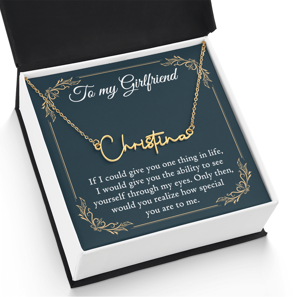 The Signature Style Name Necklace features a pretty stylized font, and is available in polished stainless steel or 18K yellow gold finish. The pendant is dually suspended on an adjustable 16”-18” cable chain for versatility. Your necklace will be custom made upon ordering in the name or word of your choice, with up to 10 characters. It's a gift that they will surely want to keep close to their heart!