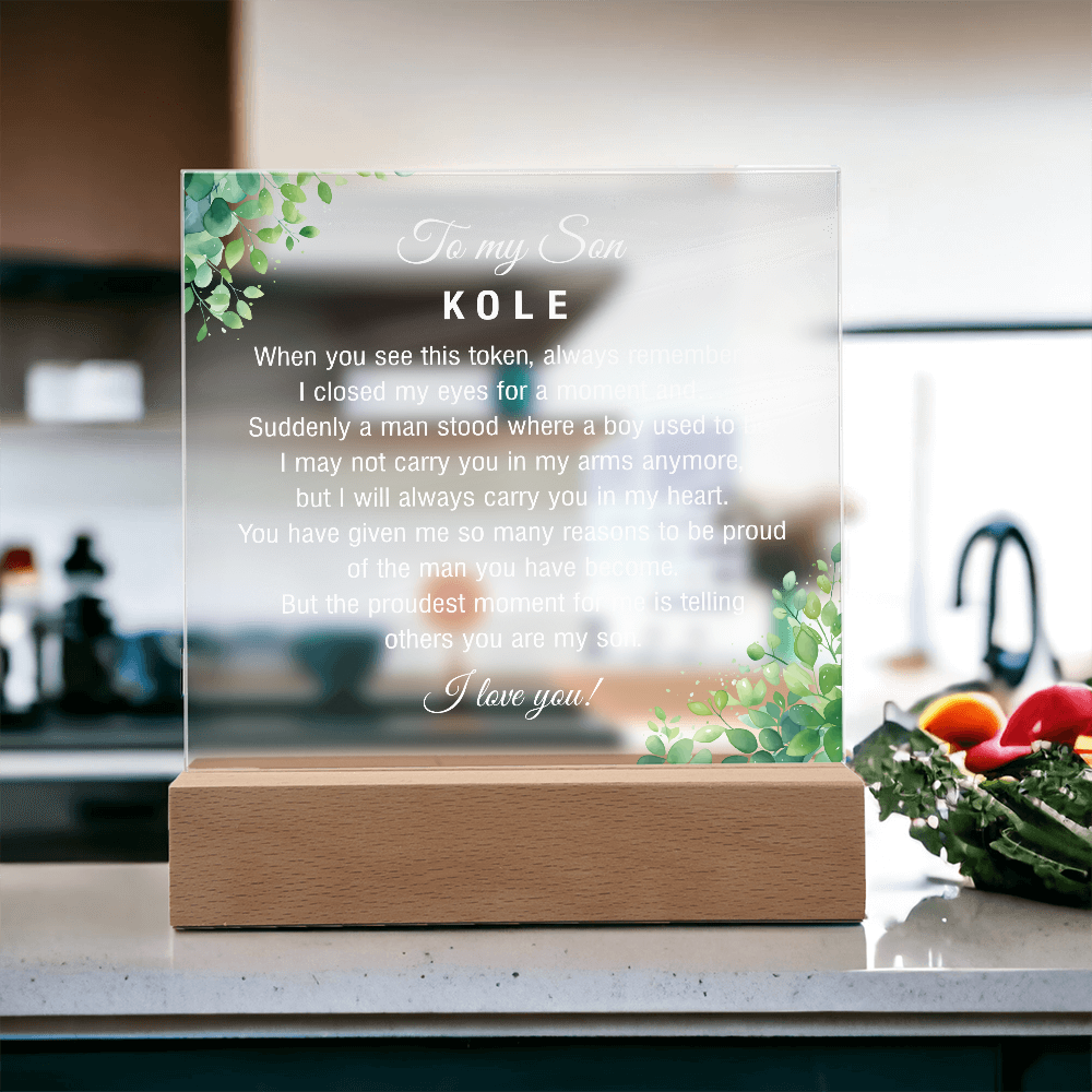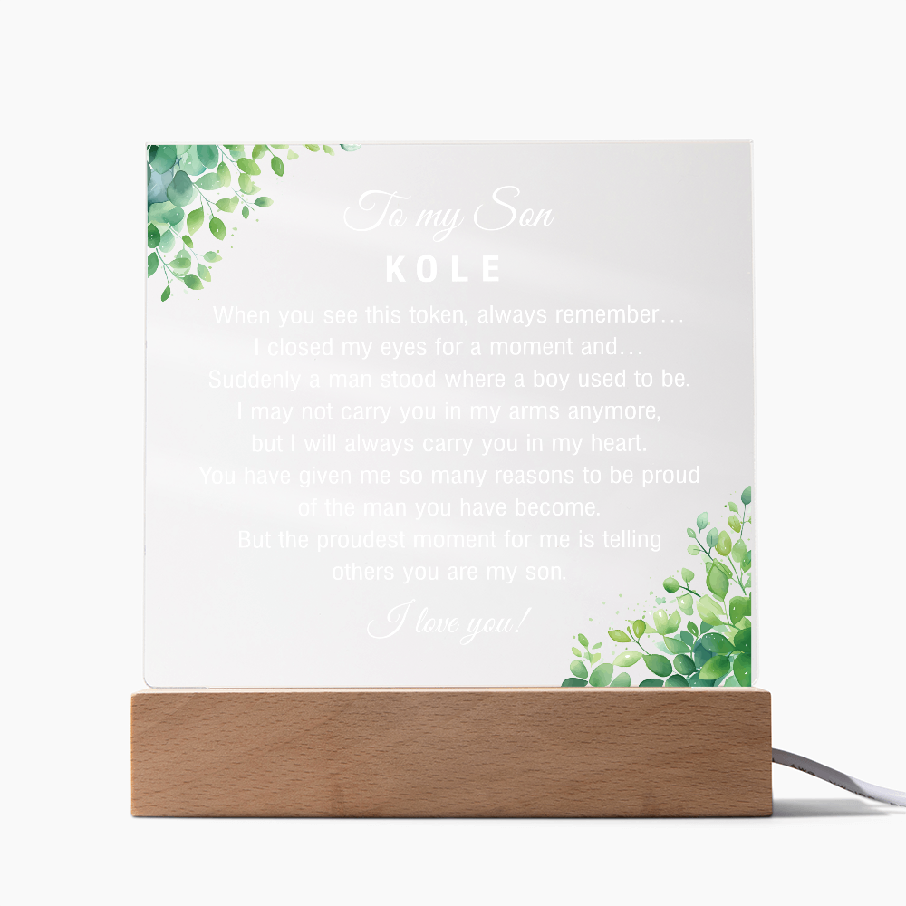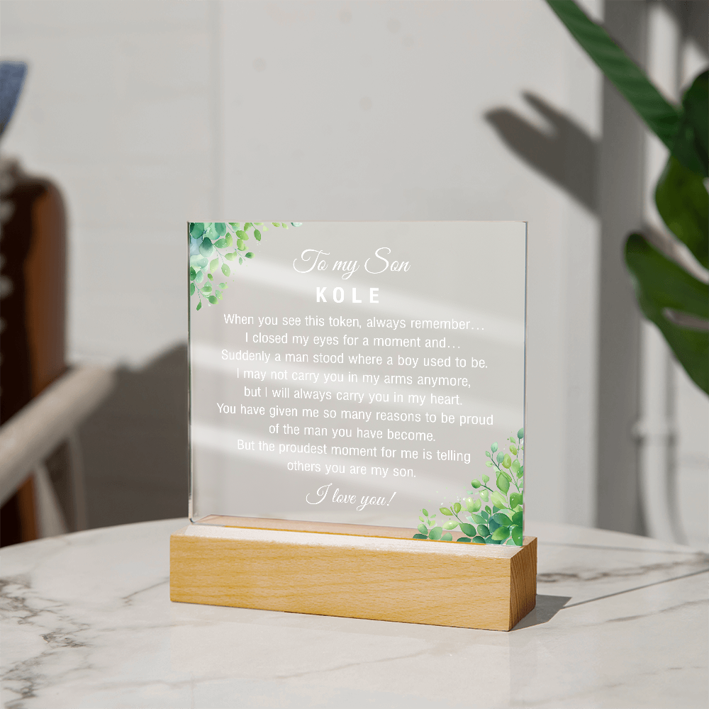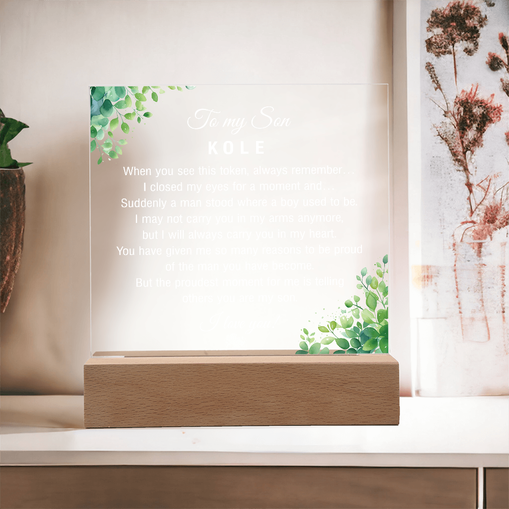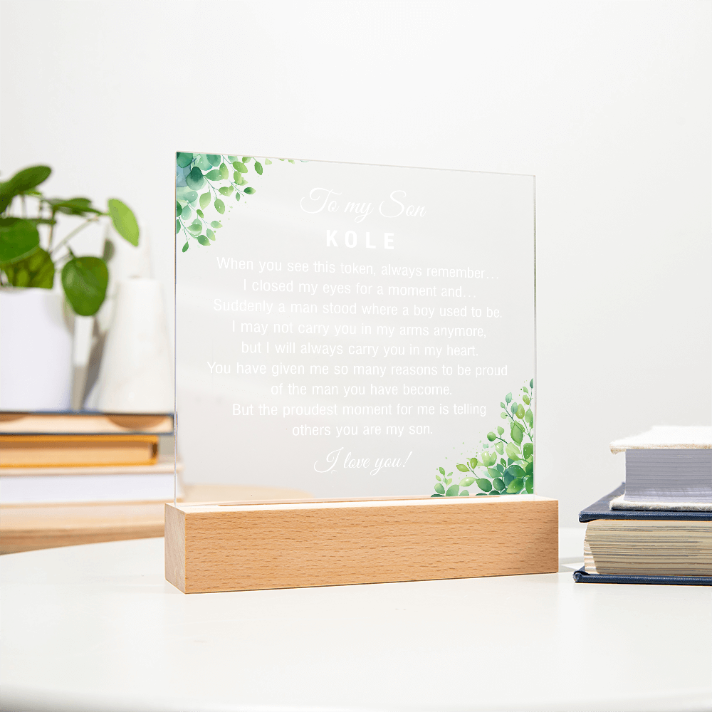 Your plaque will be crafted from premium acrylic with a professionally printed design for a polished look. It comes with a stylish wooden LED base, and you can choose between a USB plug-in option OR a cordless battery-operated option (requires 2 AAA batteries, not included). Both LED bases feature 7 vibrant colors, allowing the user to customize the lighting with various color changes and dynamic cycles.