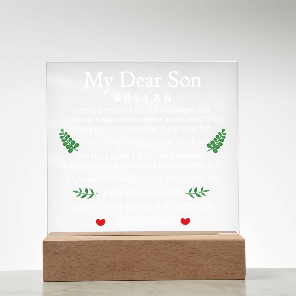 Your plaque will be crafted from premium acrylic with a professionally printed design for a polished look. It comes with a stylish wooden LED base, and you can choose between a USB plug-in option OR a cordless battery-operated option (requires 2 AAA batteries, not included). Both LED bases feature 7 vibrant colors, allowing the user to customize the lighting with various color changes and dynamic cycles.