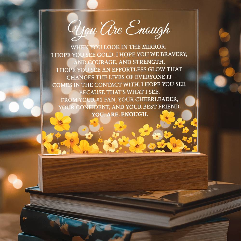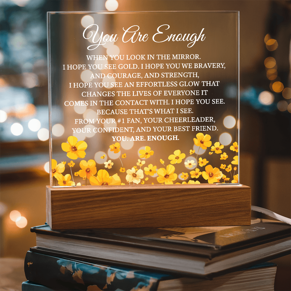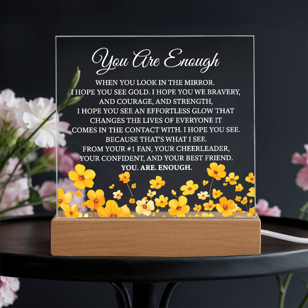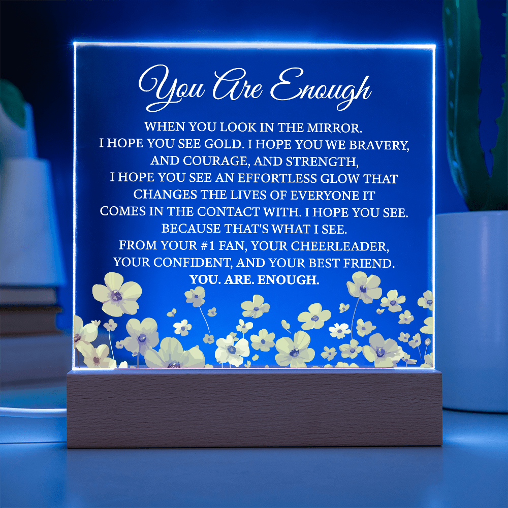 Your plaque will be crafted from premium acrylic with a professionally printed design for a polished look. It comes with a stylish wooden LED base, and you can choose between a USB plug-in option OR a cordless battery-operated option (requires 2 AAA batteries, not included). Both LED bases feature 7 vibrant colors, allowing the user to customize the lighting with various color changes and dynamic cycles.