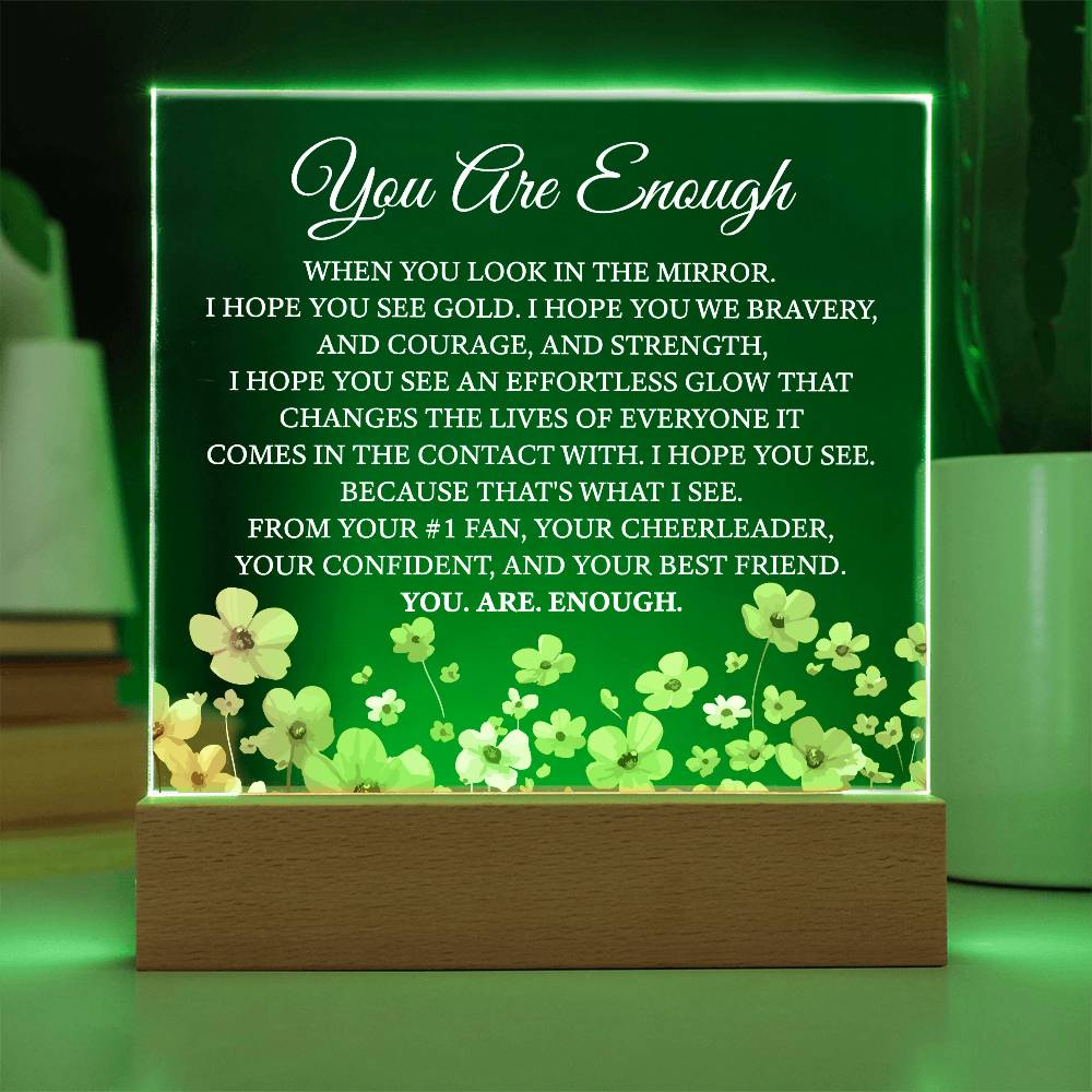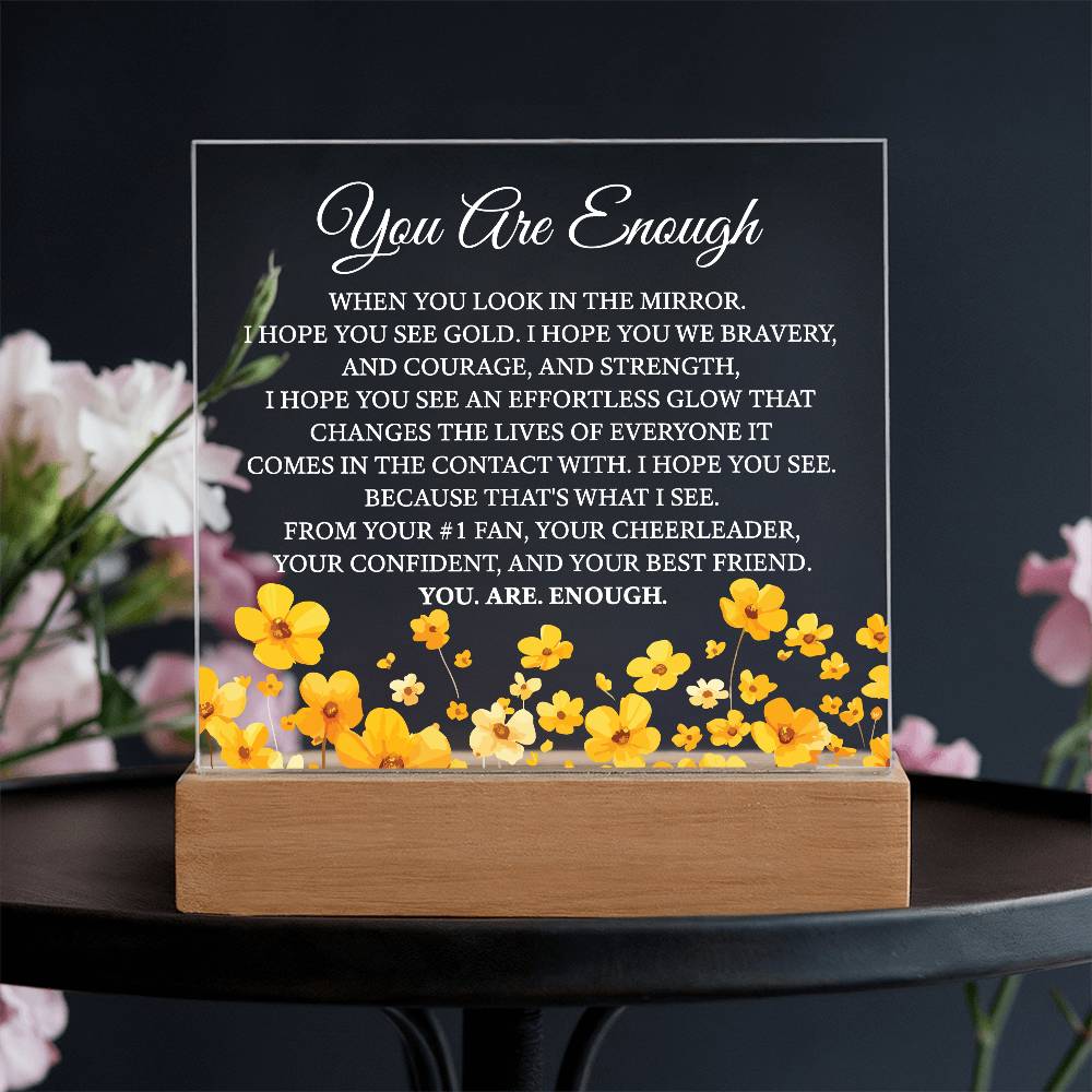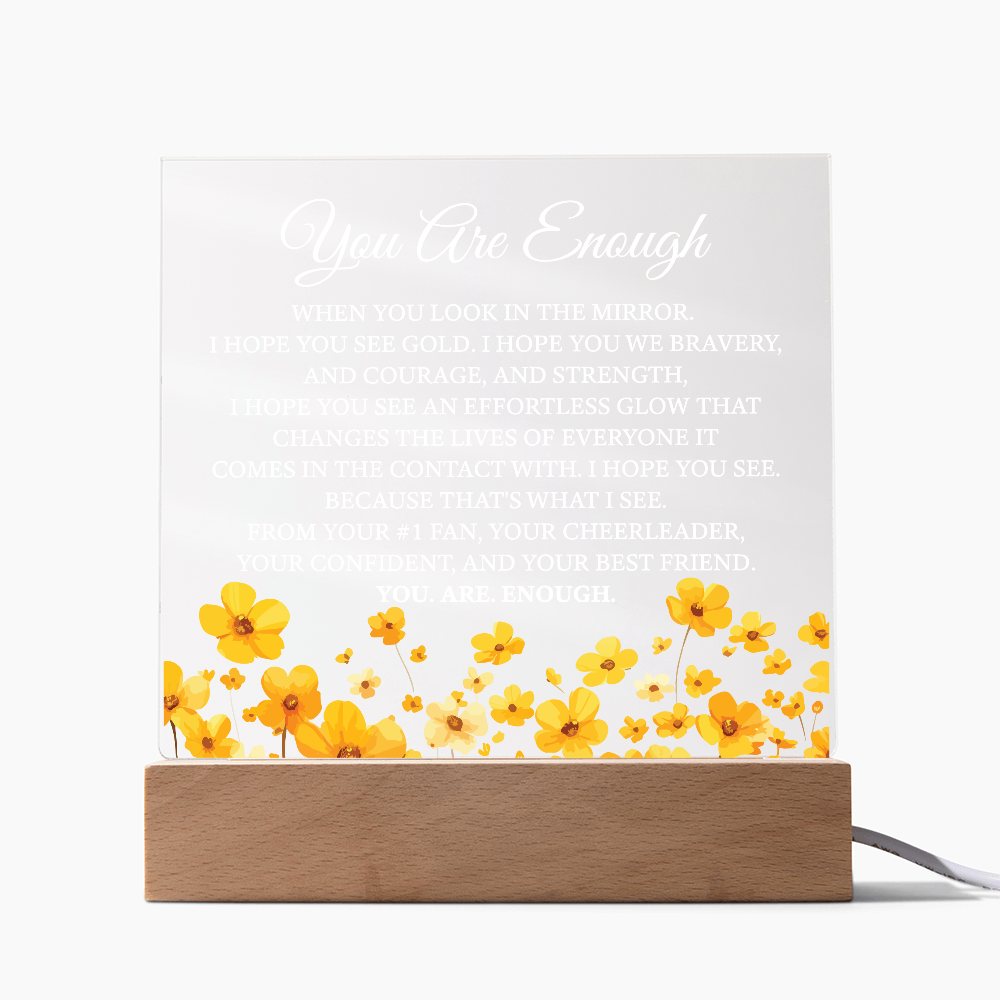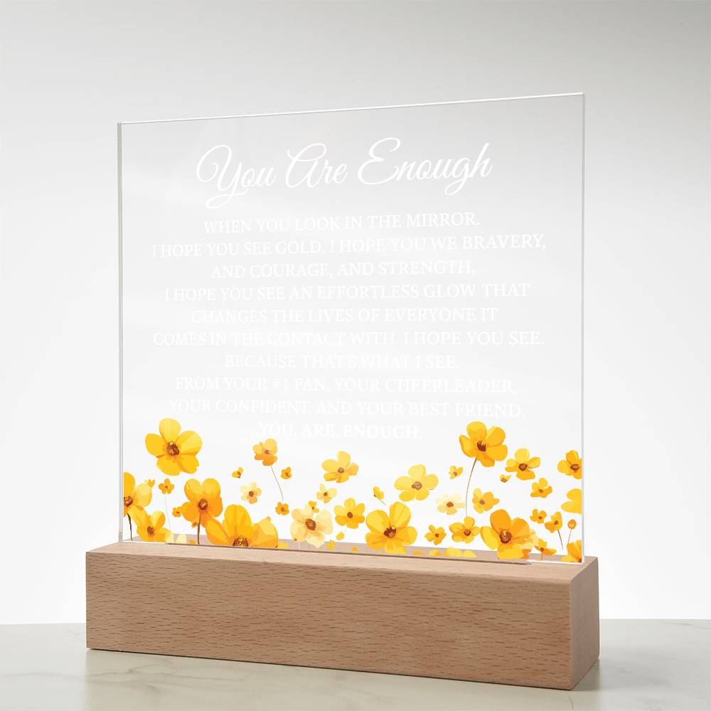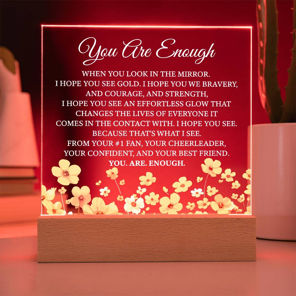 Your plaque will be crafted from premium acrylic with a professionally printed design for a polished look. It comes with a stylish wooden LED base, and you can choose between a USB plug-in option OR a cordless battery-operated option (requires 2 AAA batteries, not included). Both LED bases feature 7 vibrant colors, allowing the user to customize the lighting with various color changes and dynamic cycles.