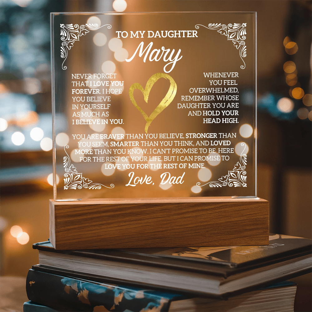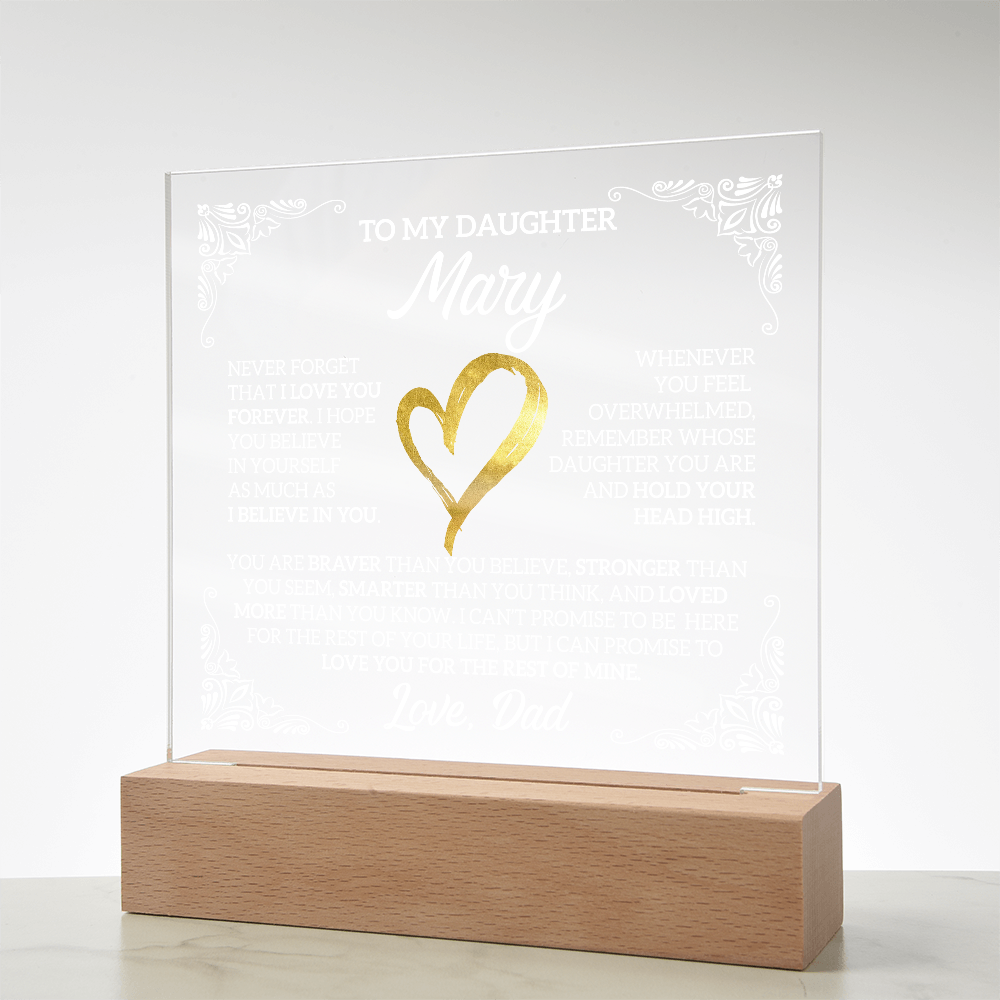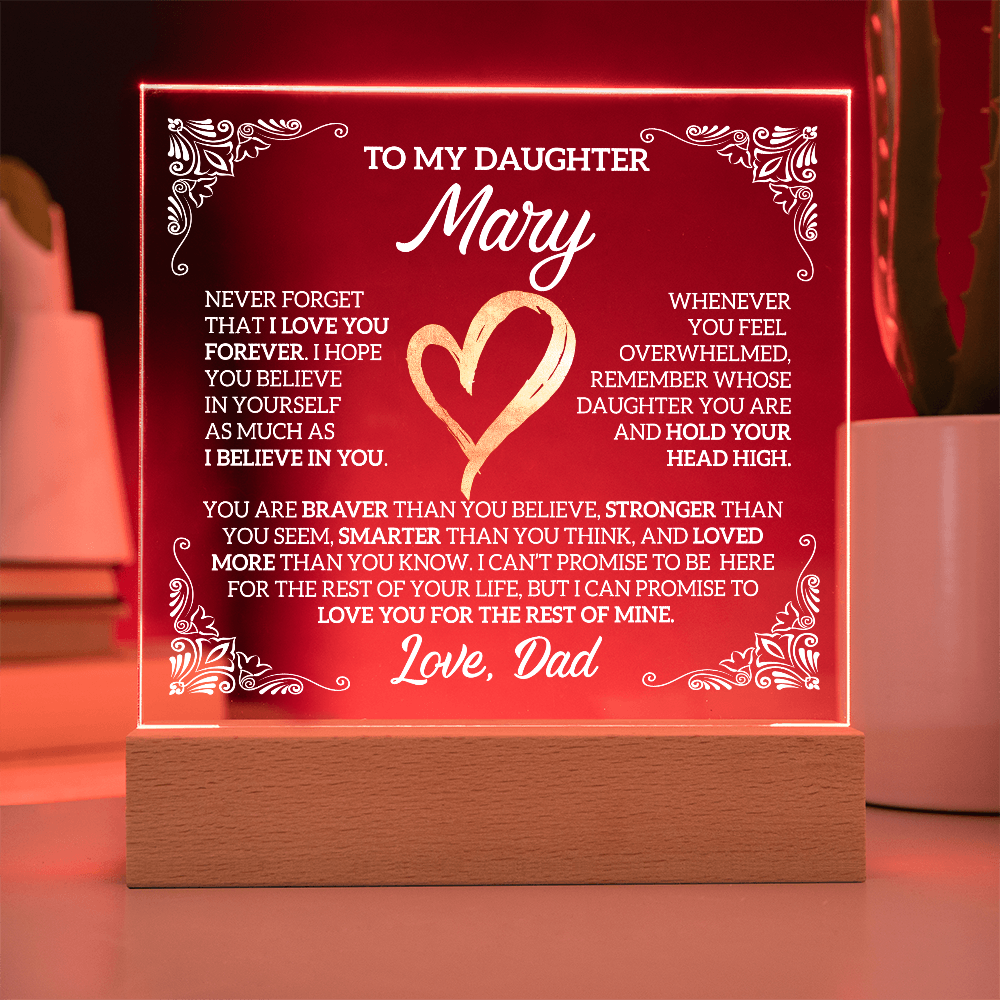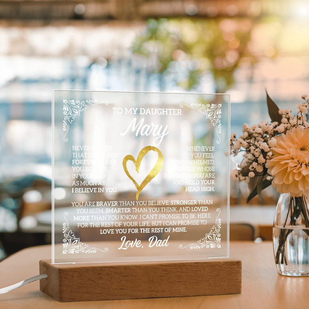 Your plaque will be crafted from premium acrylic with a professionally printed design for a polished look. It comes with a stylish wooden LED base, and you can choose between a USB plug-in option OR a cordless battery-operated option (requires 2 AAA batteries, not included). Both LED bases feature 7 vibrant colors, allowing the user to customize the lighting with various color changes and dynamic cycles.