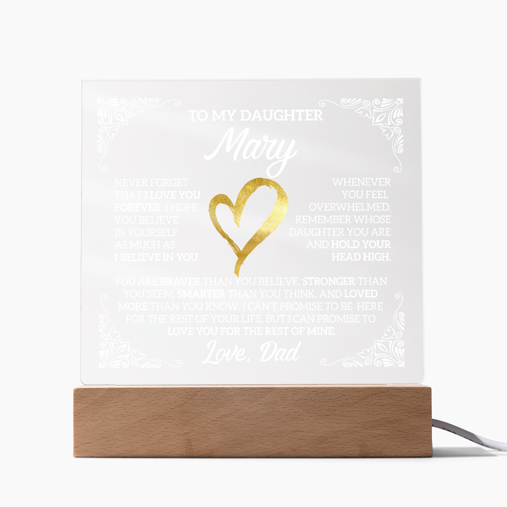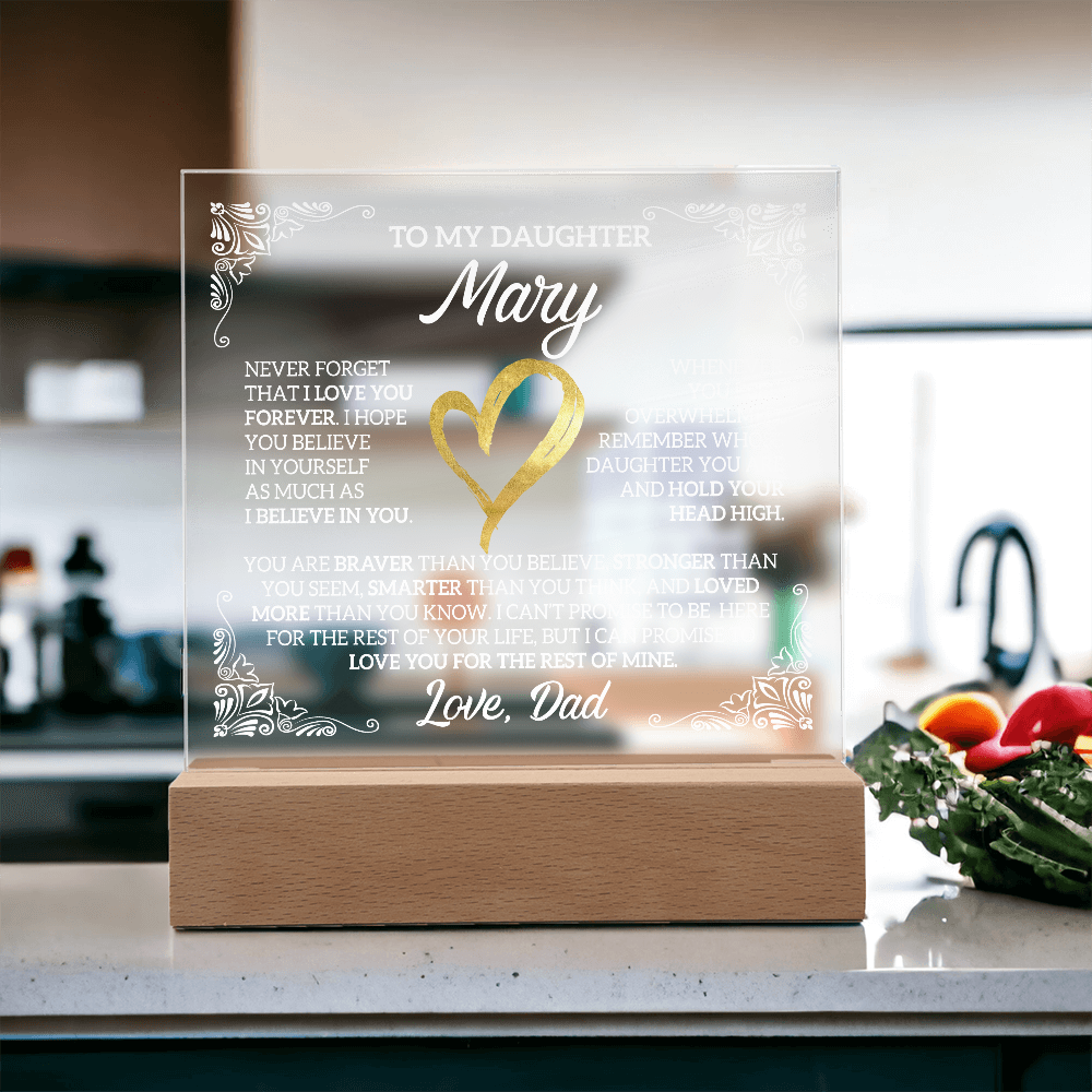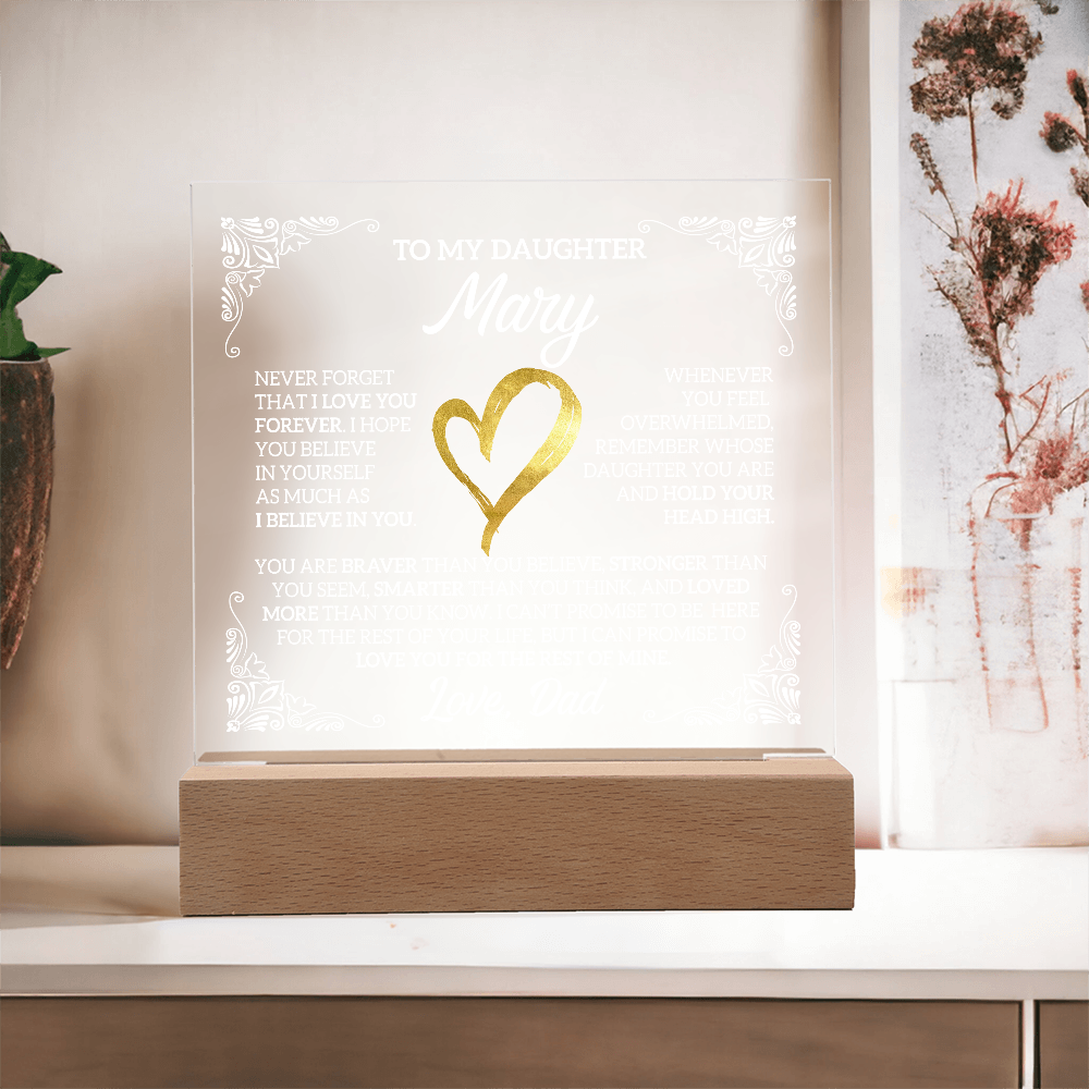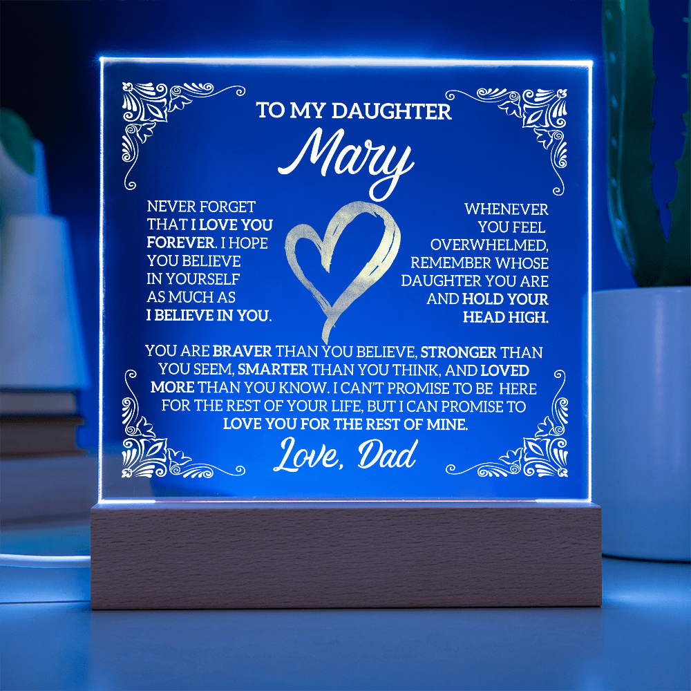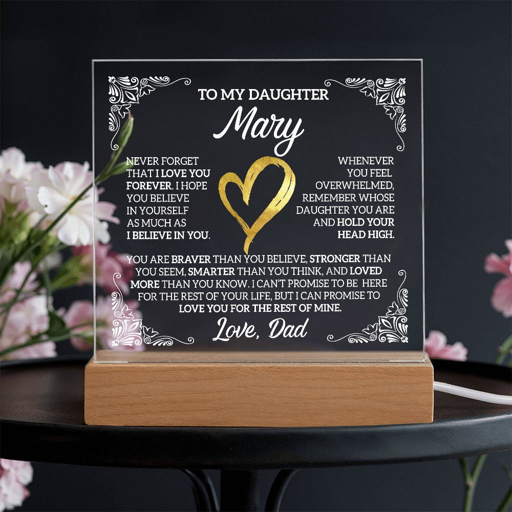 Your plaque will be crafted from premium acrylic with a professionally printed design for a polished look. It comes with a stylish wooden LED base, and you can choose between a USB plug-in option OR a cordless battery-operated option (requires 2 AAA batteries, not included). Both LED bases feature 7 vibrant colors, allowing the user to customize the lighting with various color changes and dynamic cycles.