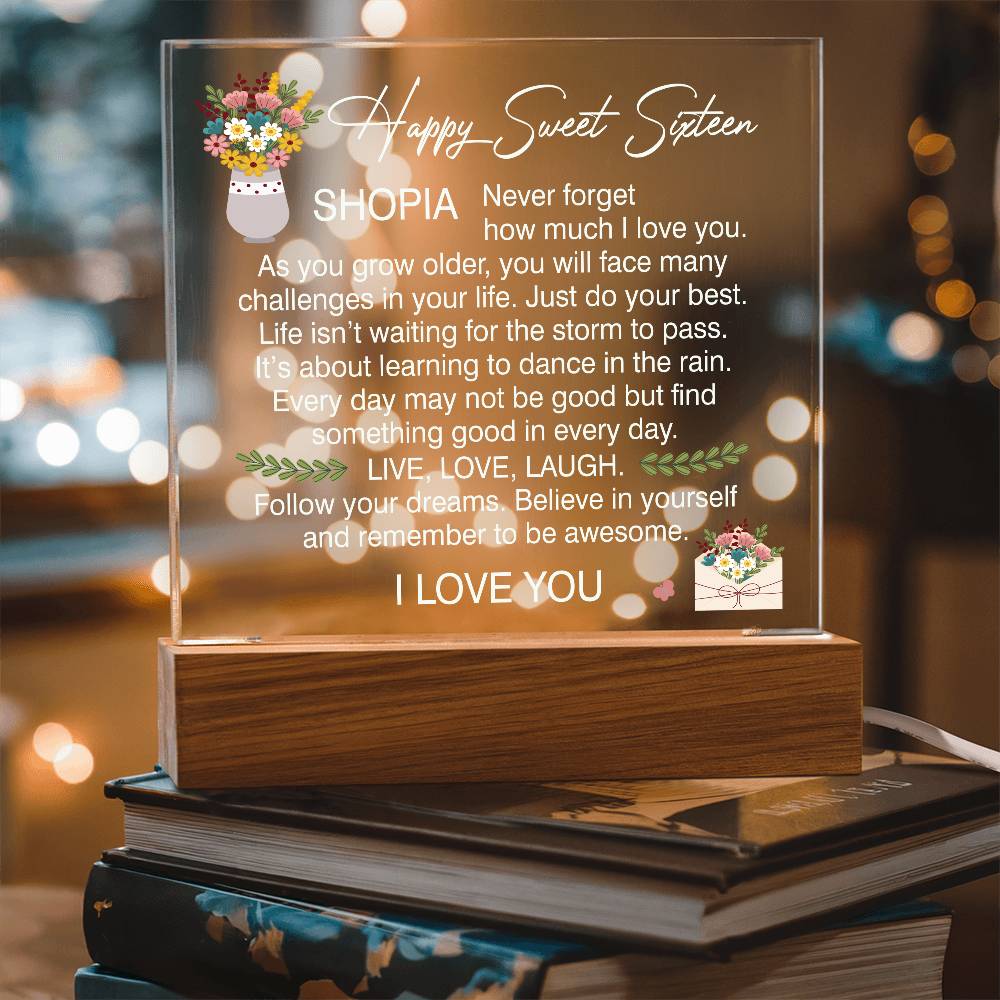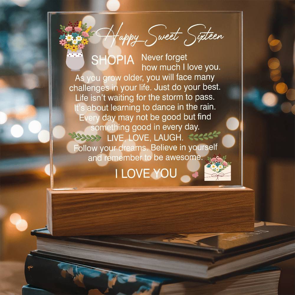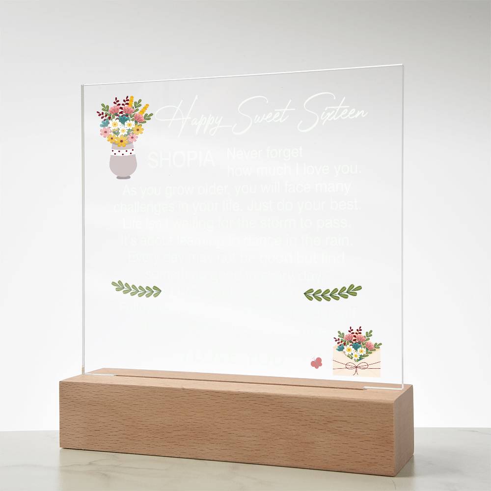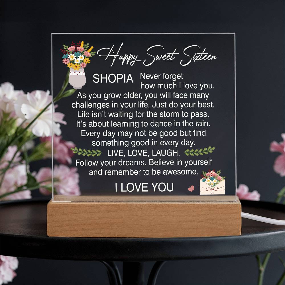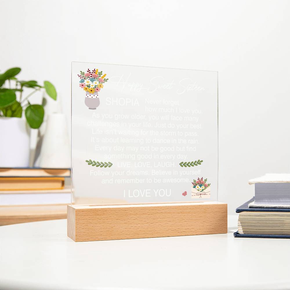 Your plaque will be crafted from premium acrylic with a professionally printed design for a polished look. It comes with a stylish wooden LED base, and you can choose between a USB plug-in option OR a cordless battery-operated option (requires 2 AAA batteries, not included). Both LED bases feature 7 vibrant colors, allowing the user to customize the lighting with various color changes and dynamic cycles.