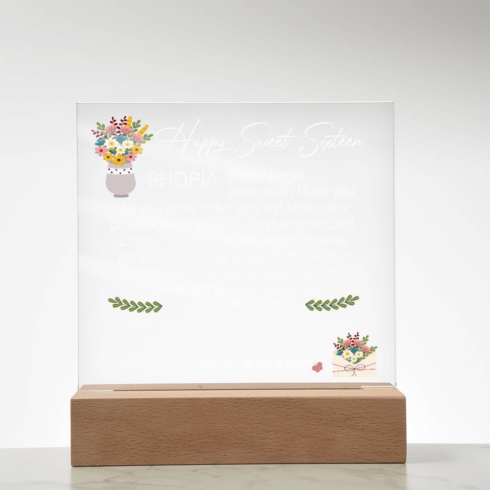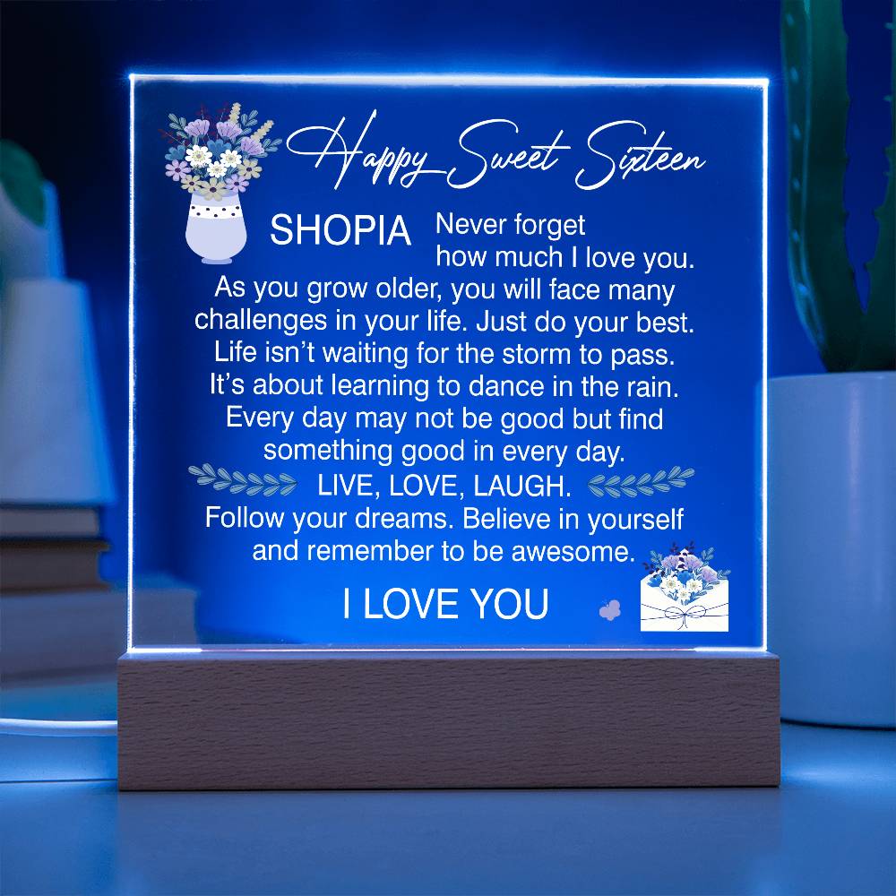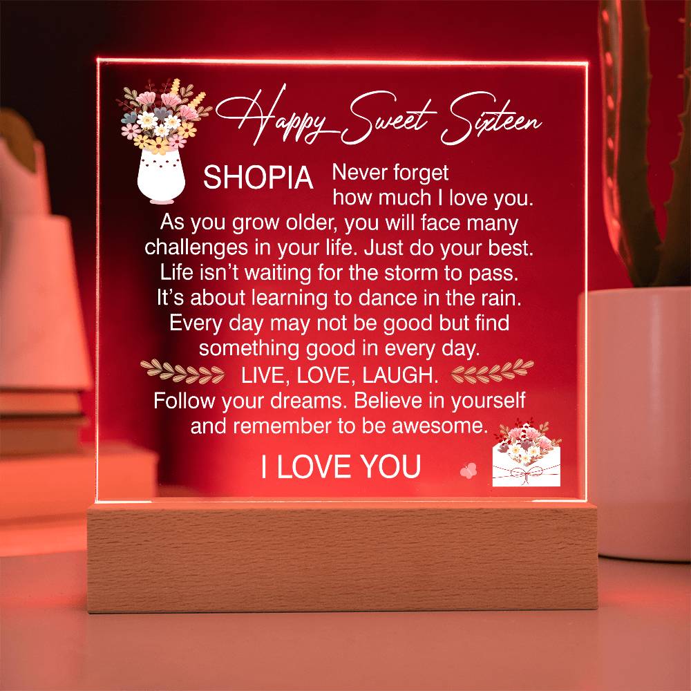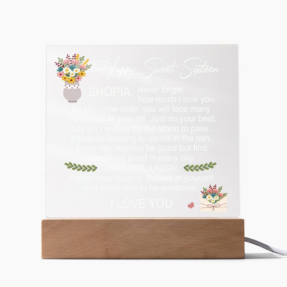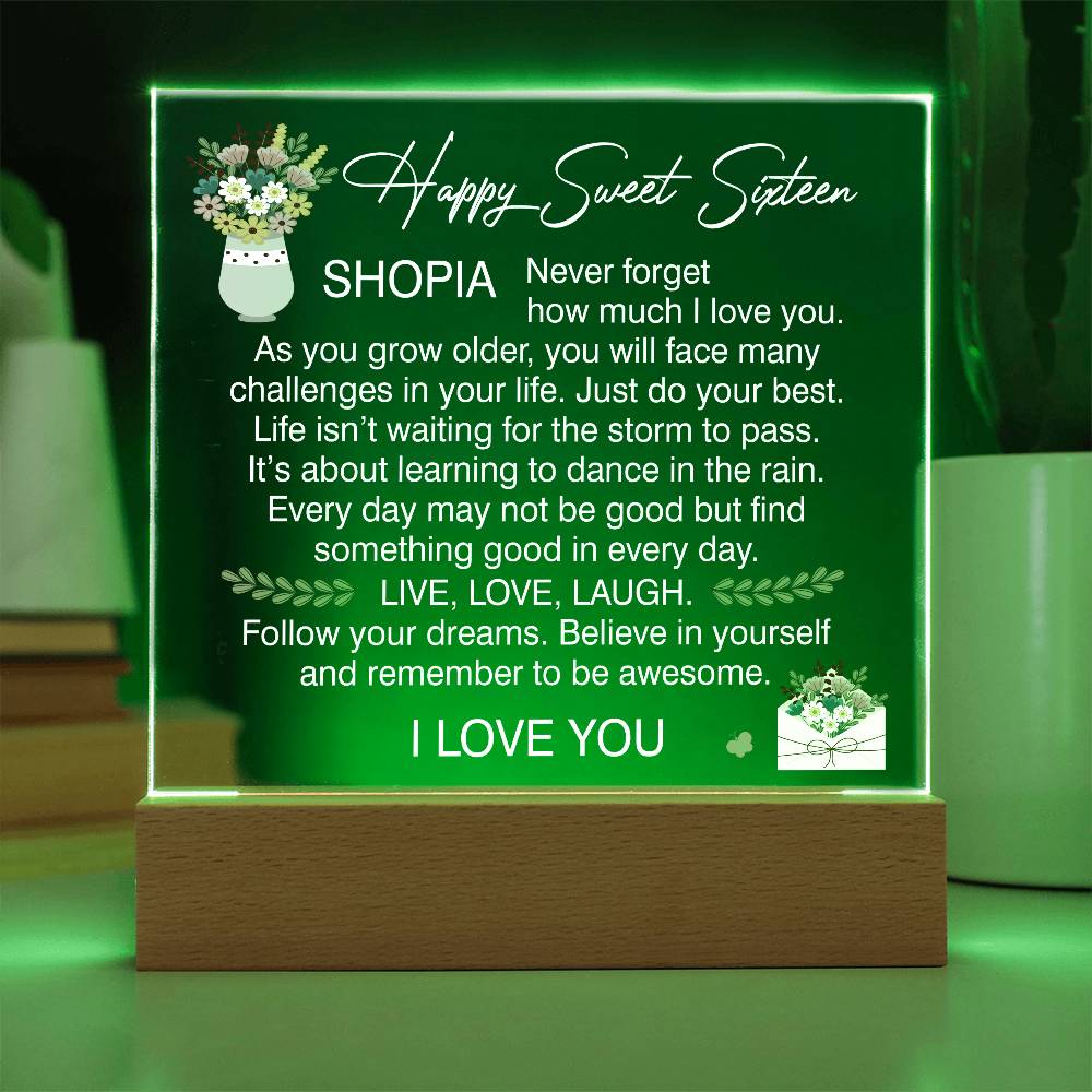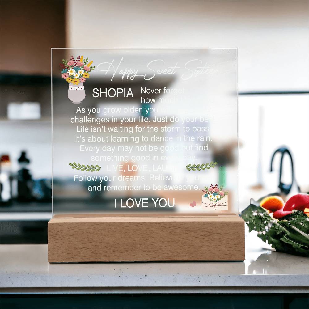 Your plaque will be crafted from premium acrylic with a professionally printed design for a polished look. It comes with a stylish wooden LED base, and you can choose between a USB plug-in option OR a cordless battery-operated option (requires 2 AAA batteries, not included). Both LED bases feature 7 vibrant colors, allowing the user to customize the lighting with various color changes and dynamic cycles.