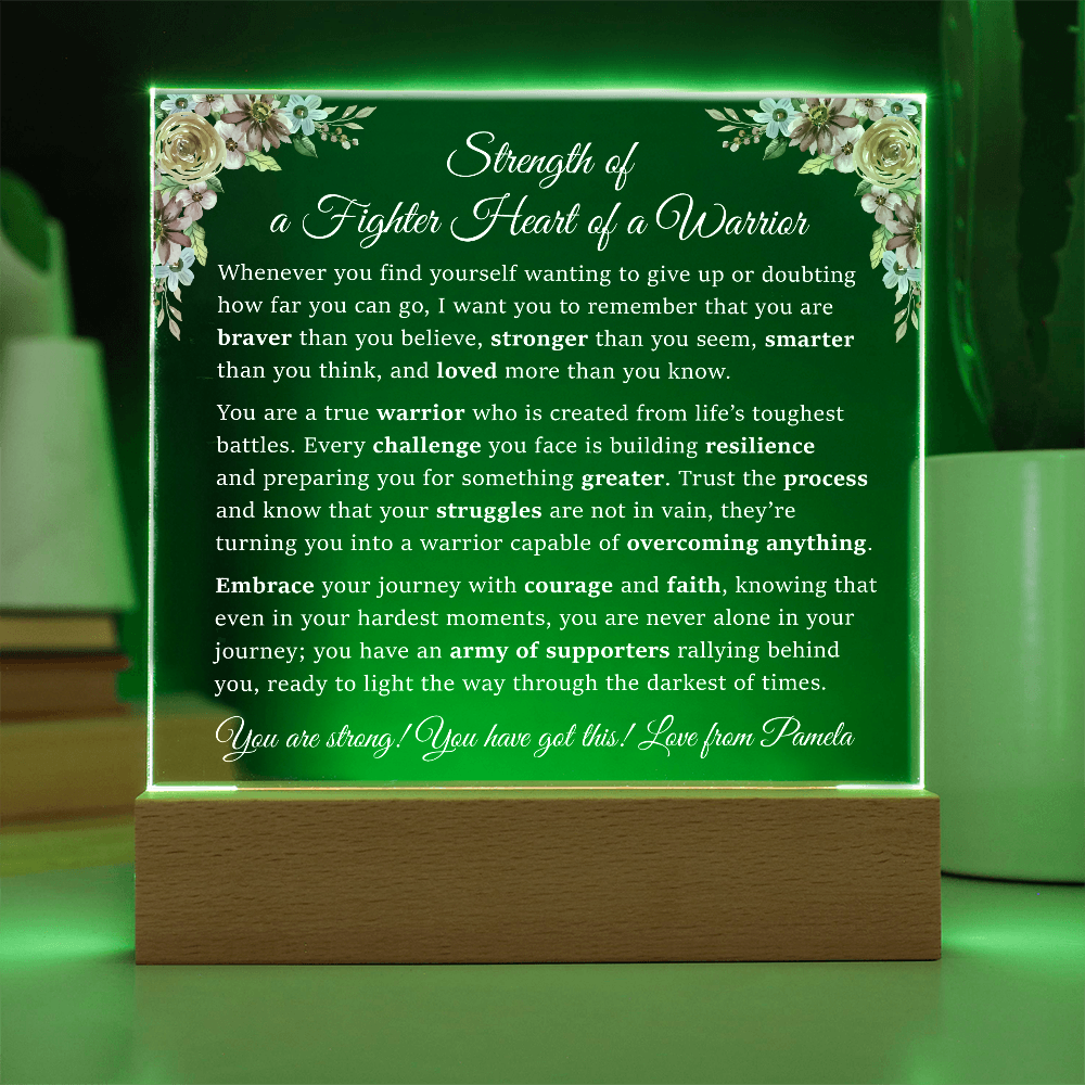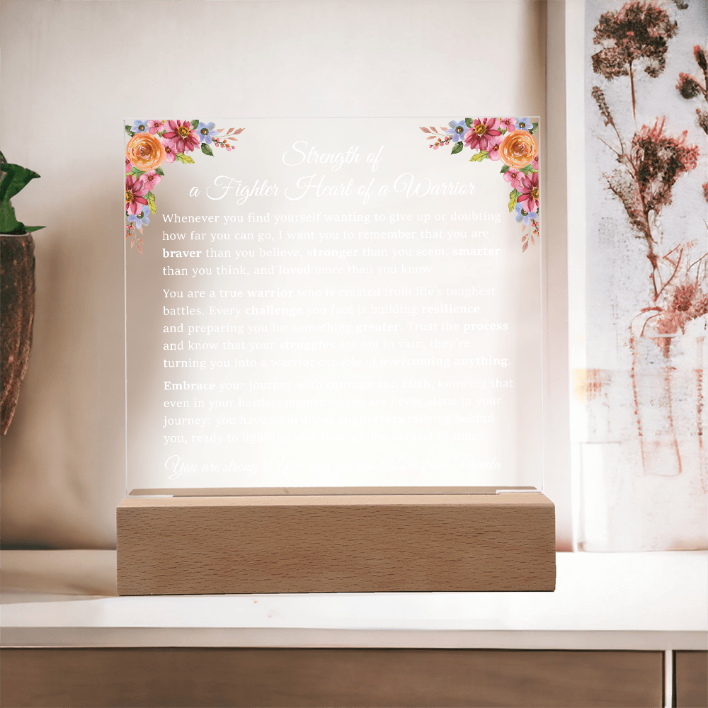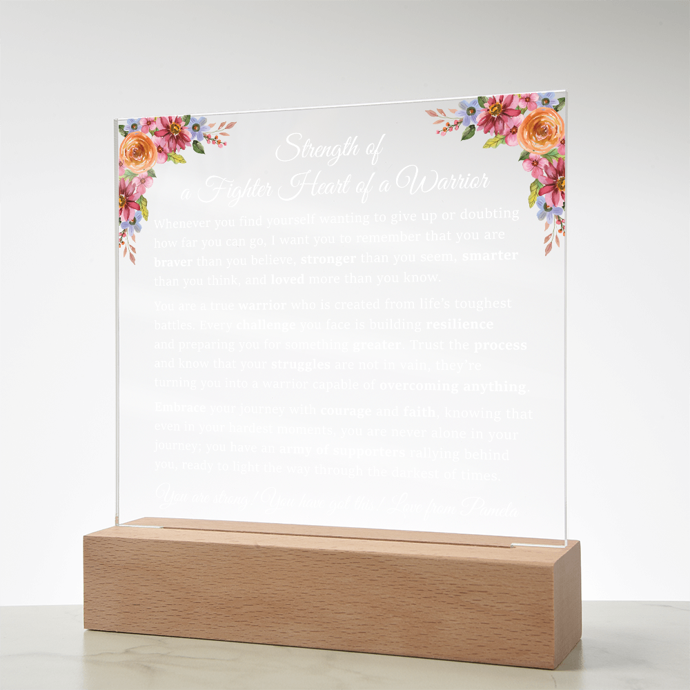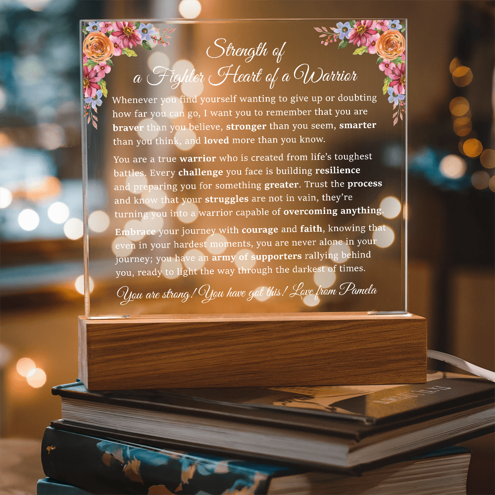 Your plaque will be crafted from premium acrylic with a professionally printed design for a polished look. It comes with a stylish wooden LED base, and you can choose between a USB plug-in option OR a cordless battery-operated option (requires 2 AAA batteries, not included). Both LED bases feature 7 vibrant colors, allowing the user to customize the lighting with various color changes and dynamic cycles.