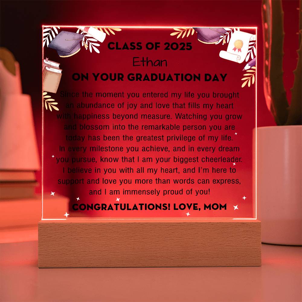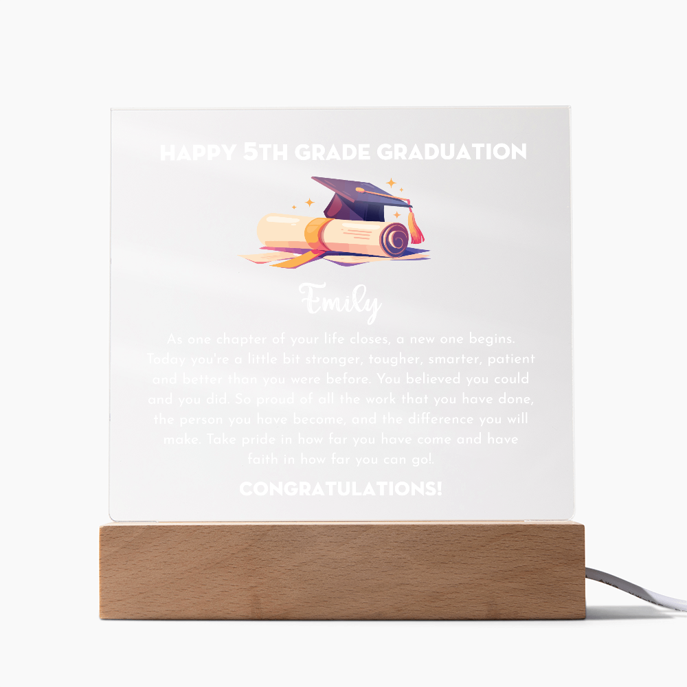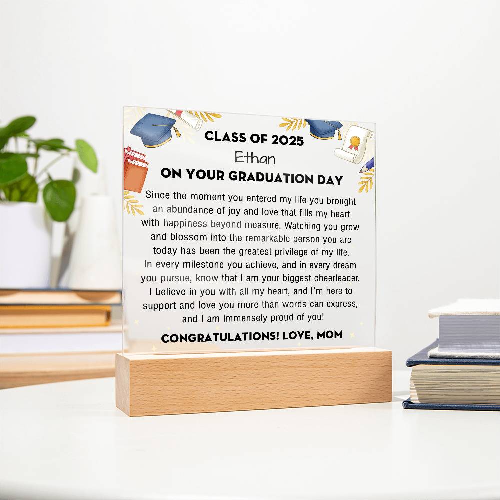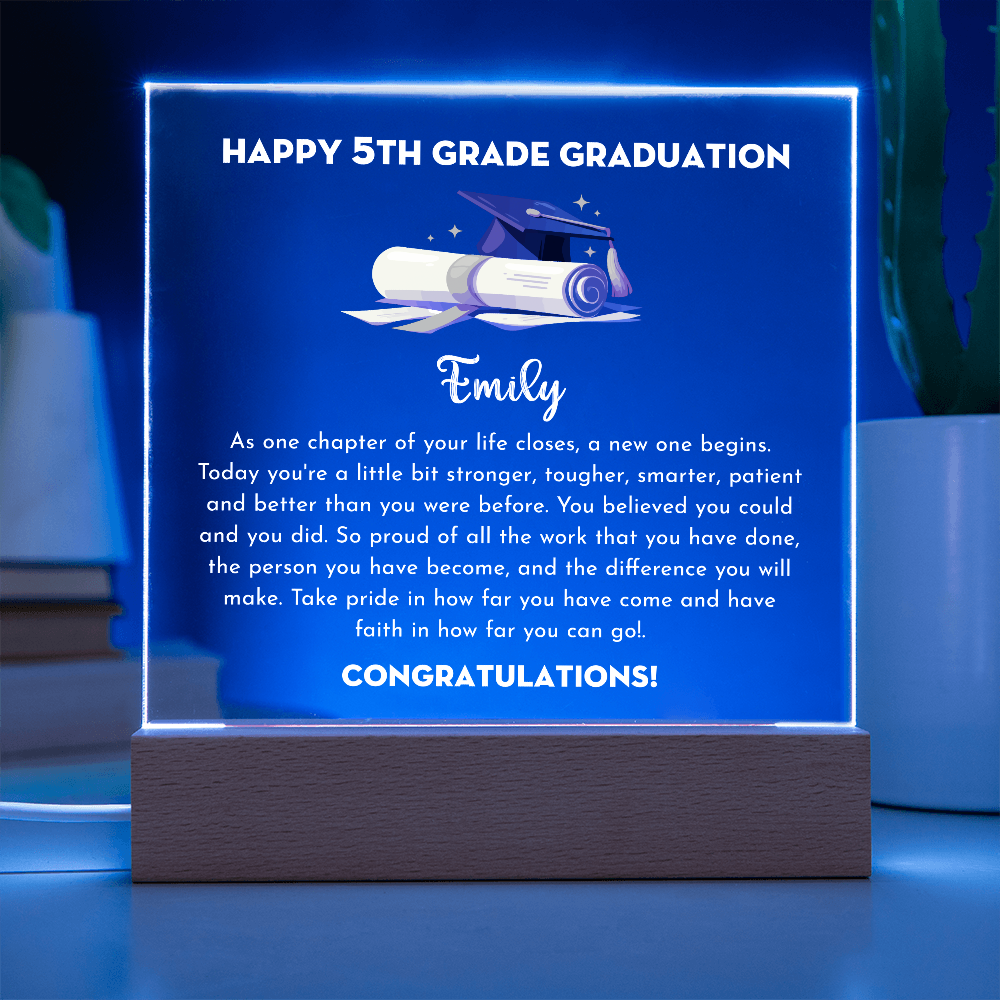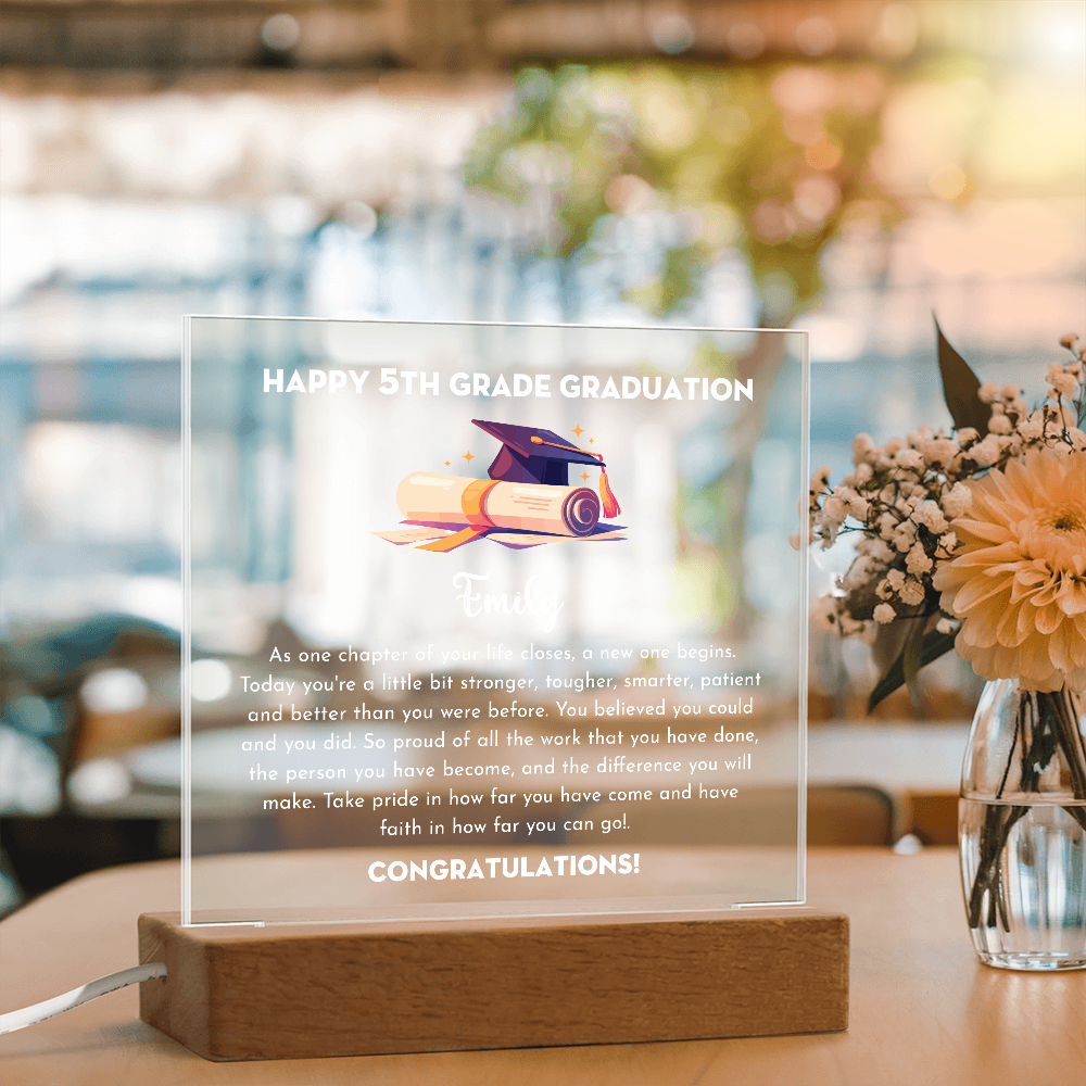 Your plaque will be crafted from premium acrylic with a professionally printed design for a polished look. It comes with a stylish wooden LED base, and you can choose between a USB plug-in option OR a cordless battery-operated option (requires 2 AAA batteries, not included). Both LED bases feature 7 vibrant colors, allowing the user to customize the lighting with various color changes and dynamic cycles.