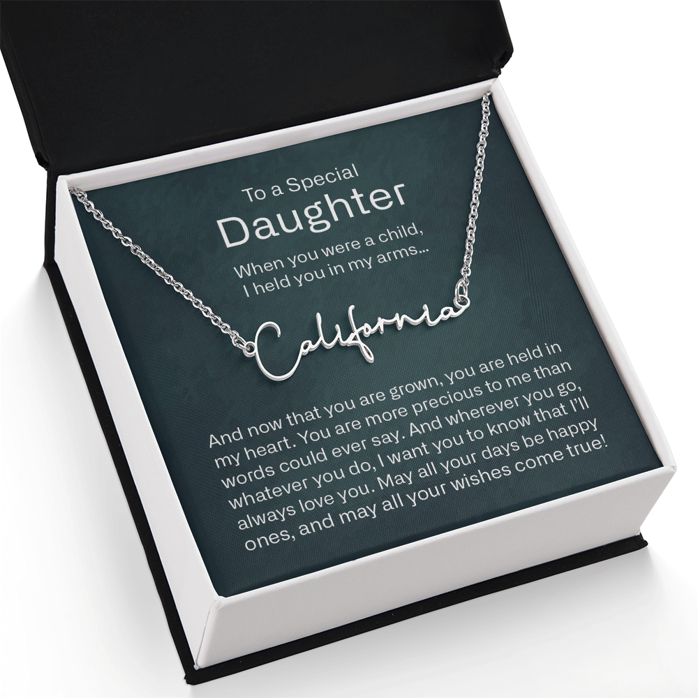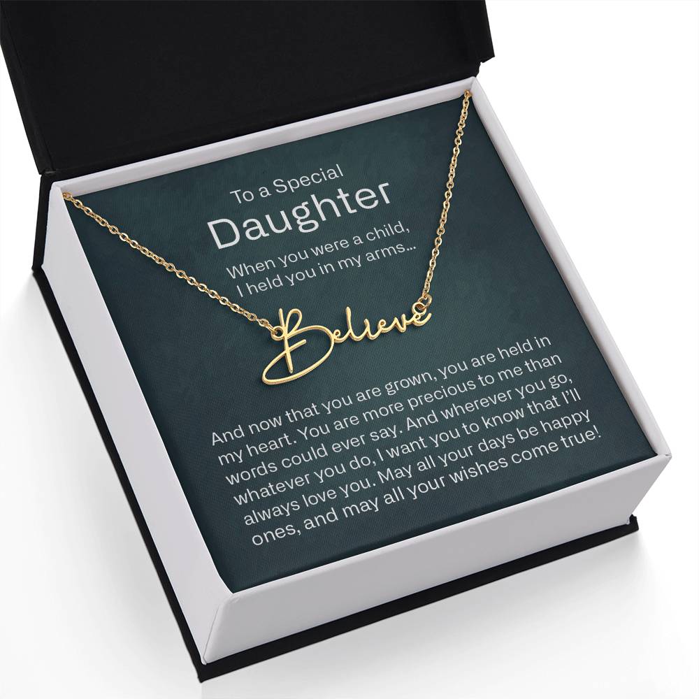 The Signature Style Name Necklace features a pretty stylized font, and is available in polished stainless steel or 18K yellow gold finish. The pendant is dually suspended on an adjustable 16”-18” cable chain for versatility. Your necklace will be custom made upon ordering in the name or word of your choice, with up to 10 characters. It's a gift that they will surely want to keep close to their heart!