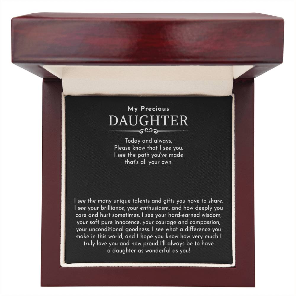Your piece is lovingly packaged in a complimentary soft touch box for easy gifting. Elevate your presentation by upgrading to the mahogany style luxury box, which features a brilliant LED spotlight.