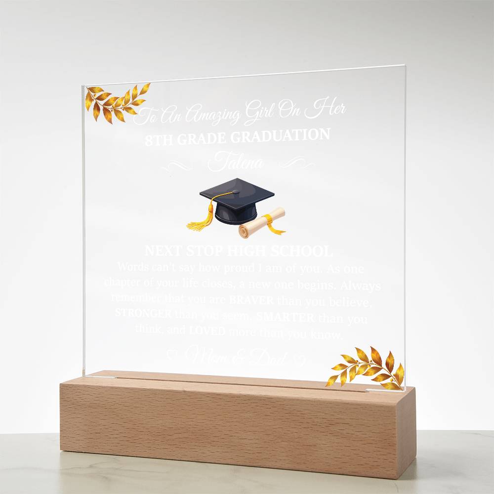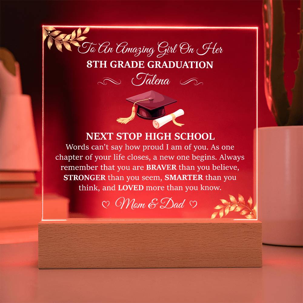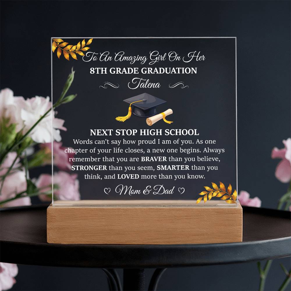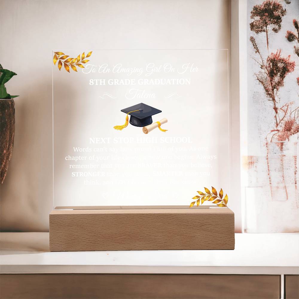 Your plaque will be crafted from premium acrylic with a professionally printed design for a polished look. It comes with a stylish wooden LED base, and you can choose between a USB plug-in option OR a cordless battery-operated option (requires 2 AAA batteries, not included). Both LED bases feature 7 vibrant colors, allowing the user to customize the lighting with various color changes and dynamic cycles.