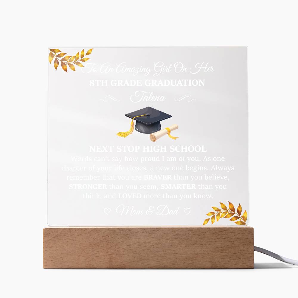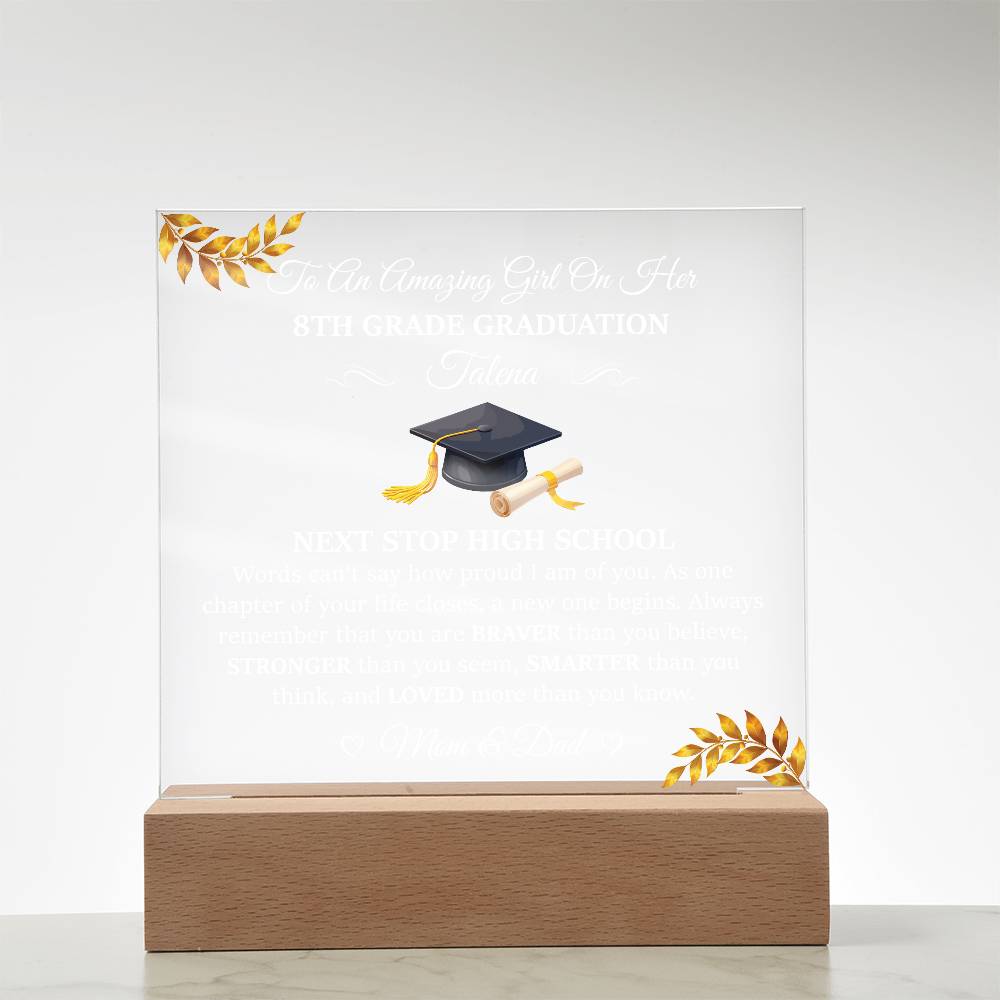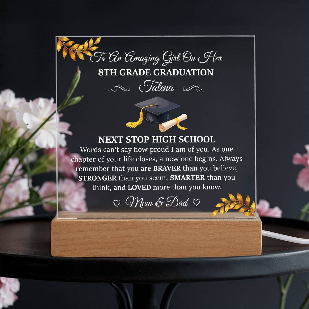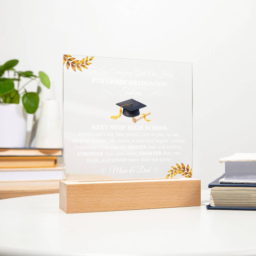 Your plaque will be crafted from premium acrylic with a professionally printed design for a polished look. It comes with a stylish wooden LED base, and you can choose between a USB plug-in option OR a cordless battery-operated option (requires 2 AAA batteries, not included). Both LED bases feature 7 vibrant colors, allowing the user to customize the lighting with various color changes and dynamic cycles.