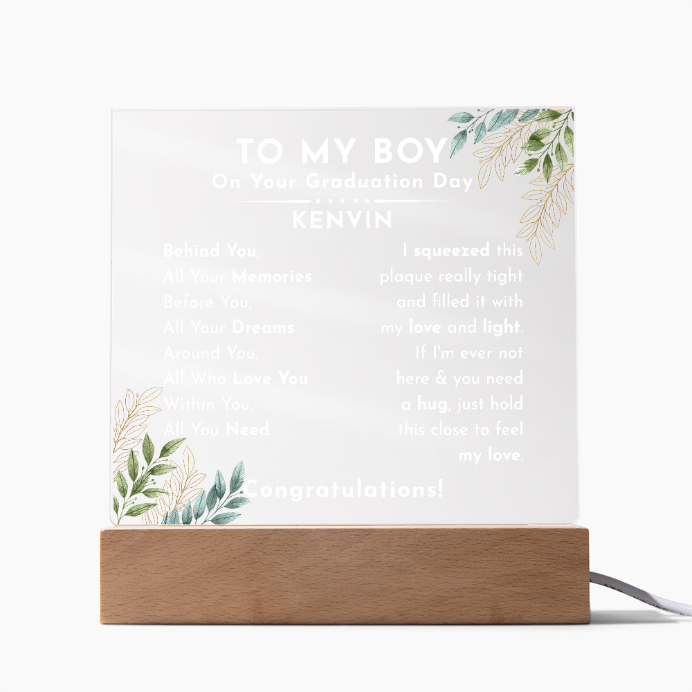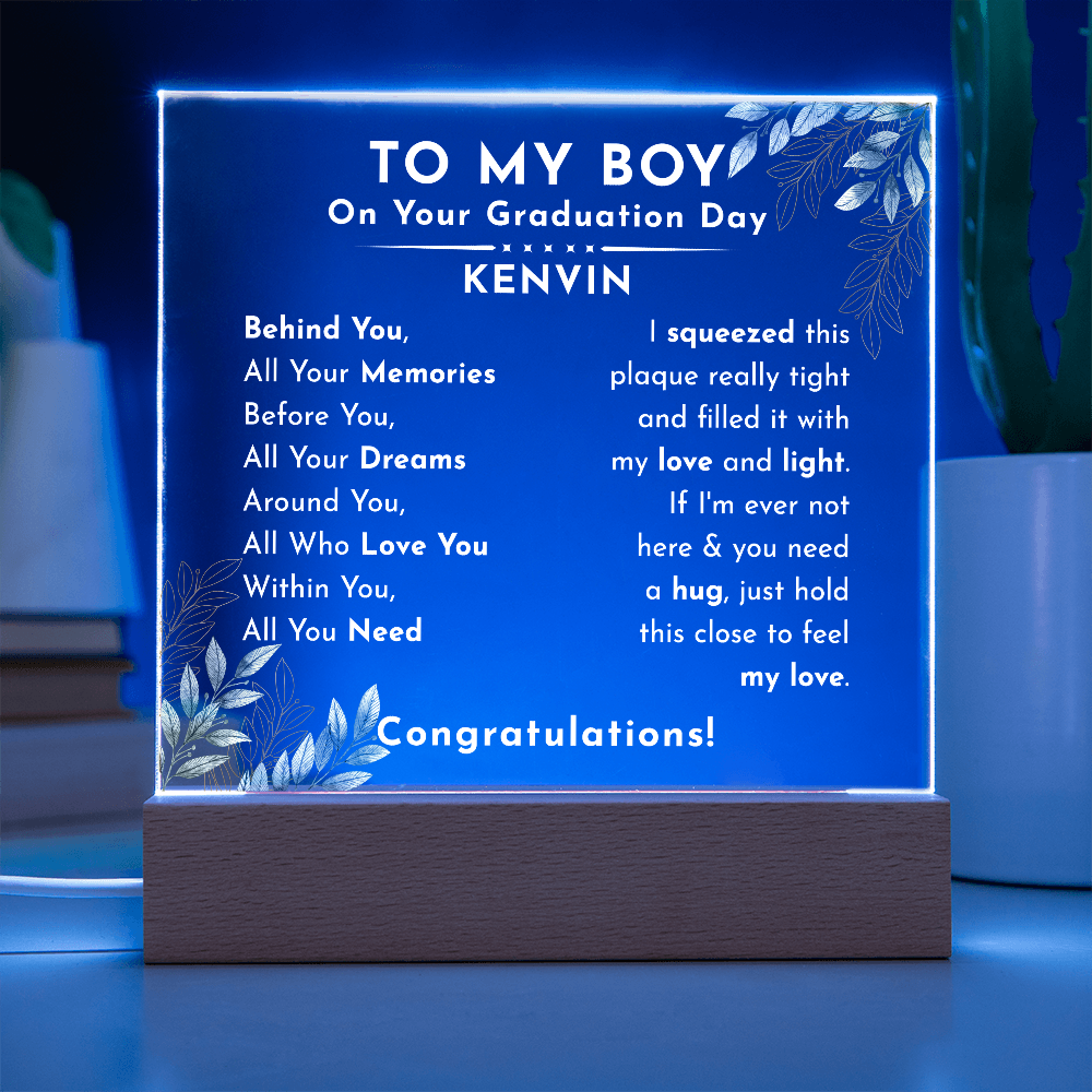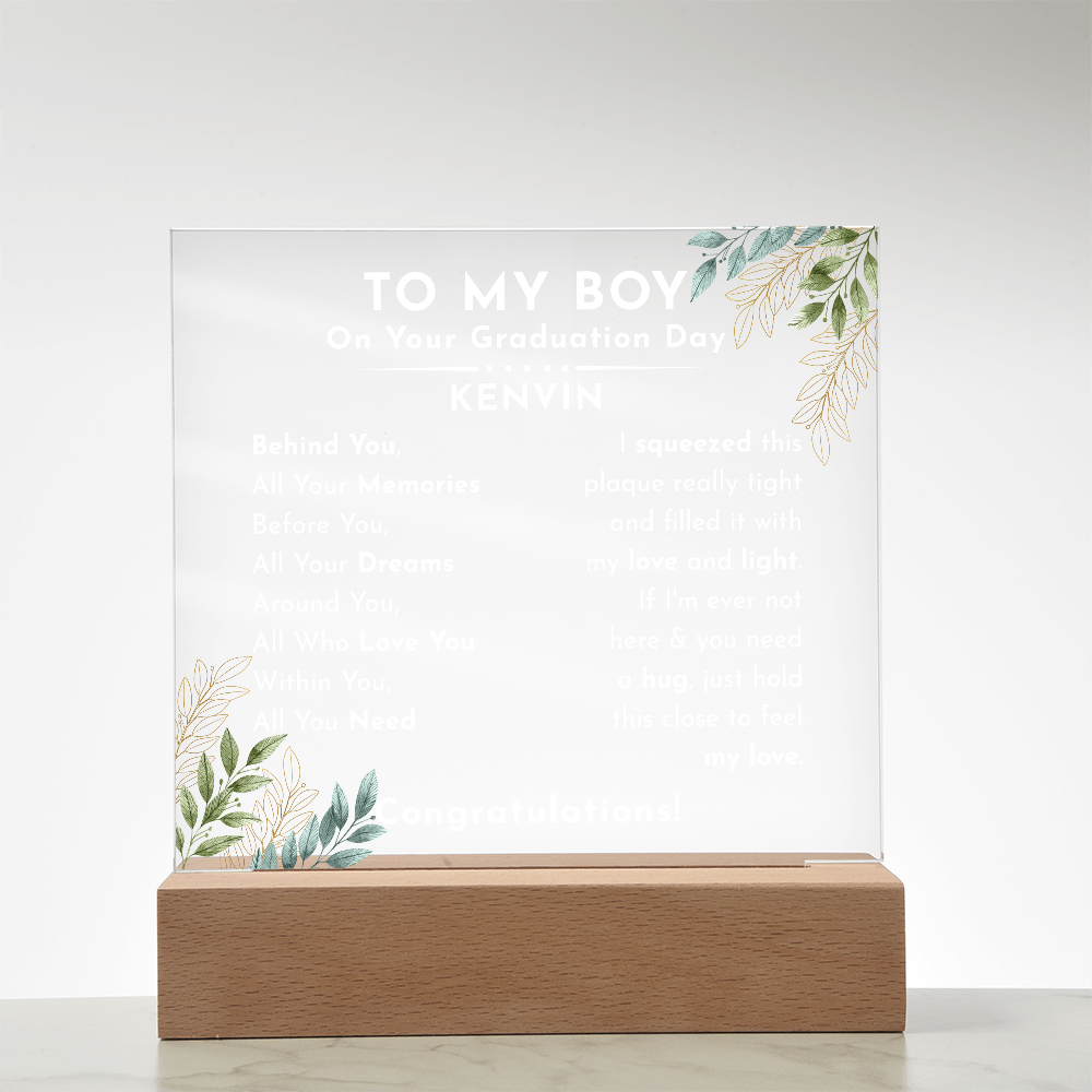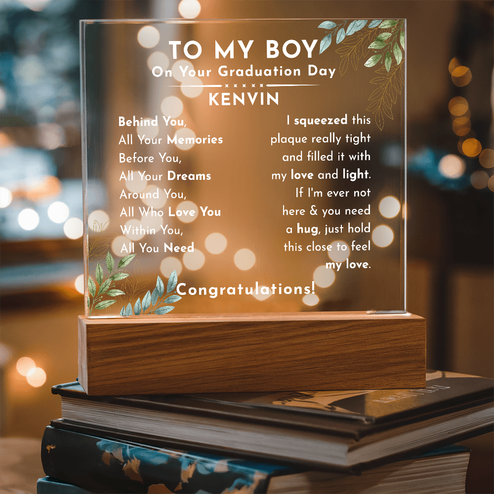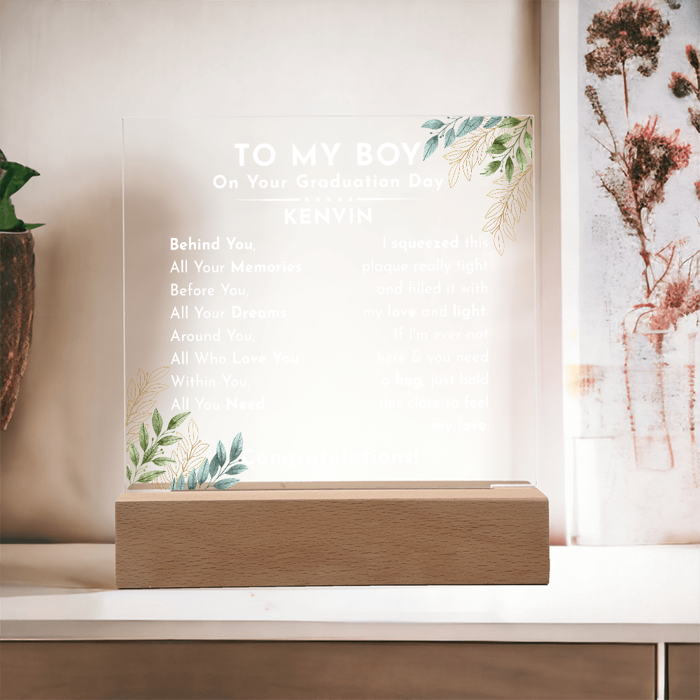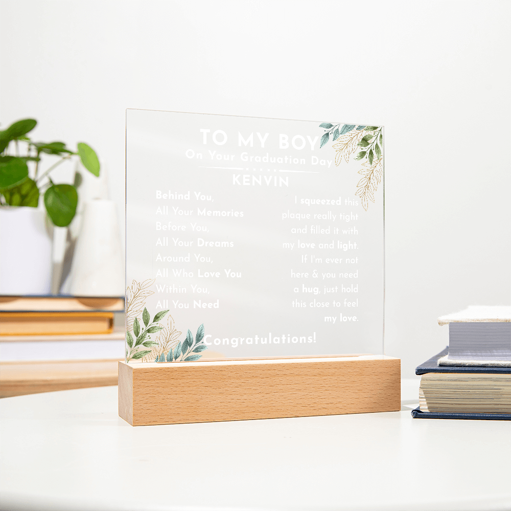 Your plaque will be crafted from premium acrylic with a professionally printed design for a polished look. It comes with a stylish wooden LED base, and you can choose between a USB plug-in option OR a cordless battery-operated option (requires 2 AAA batteries, not included). Both LED bases feature 7 vibrant colors, allowing the user to customize the lighting with various color changes and dynamic cycles.