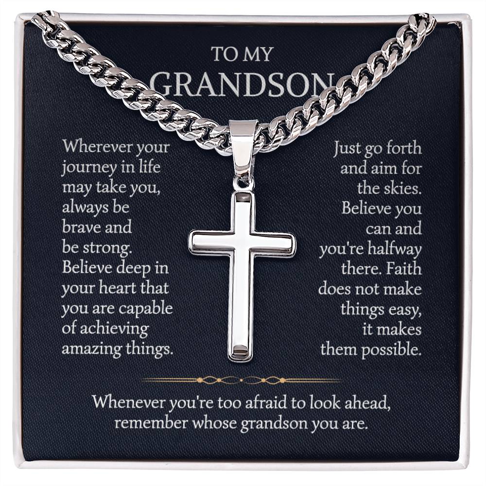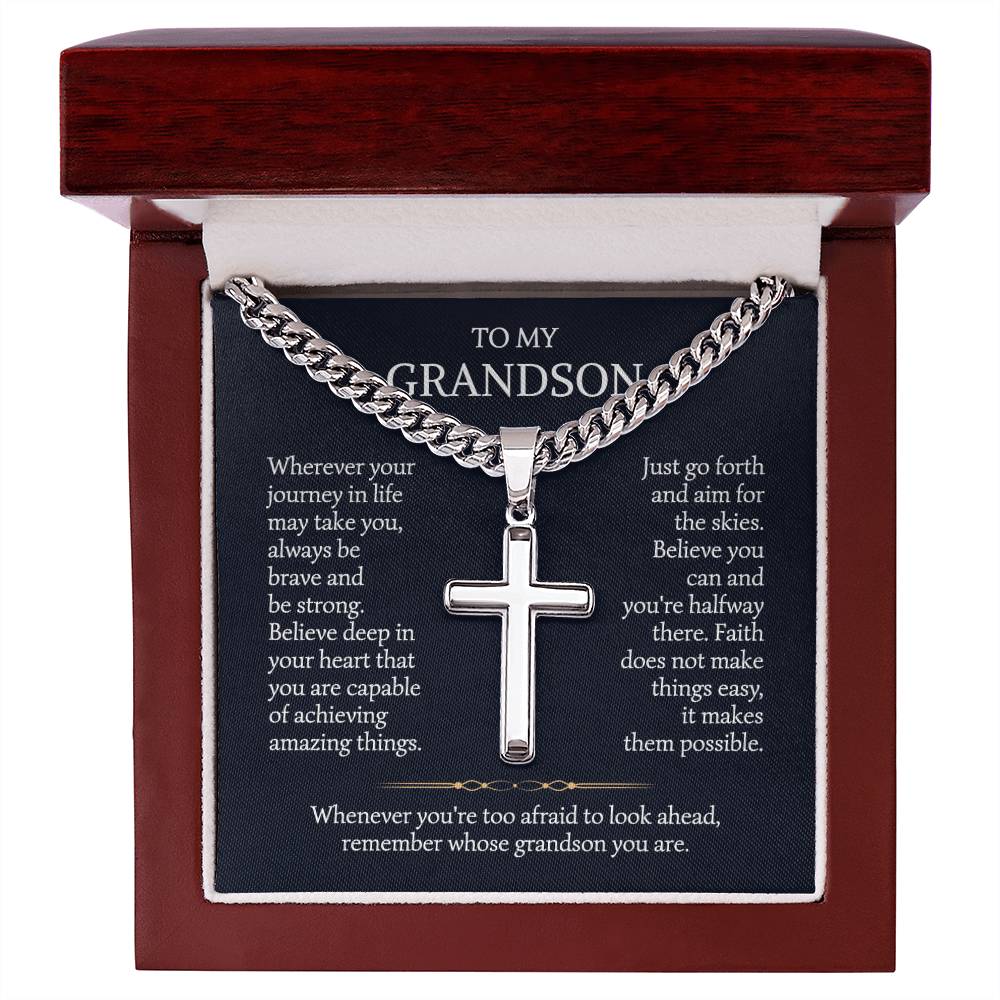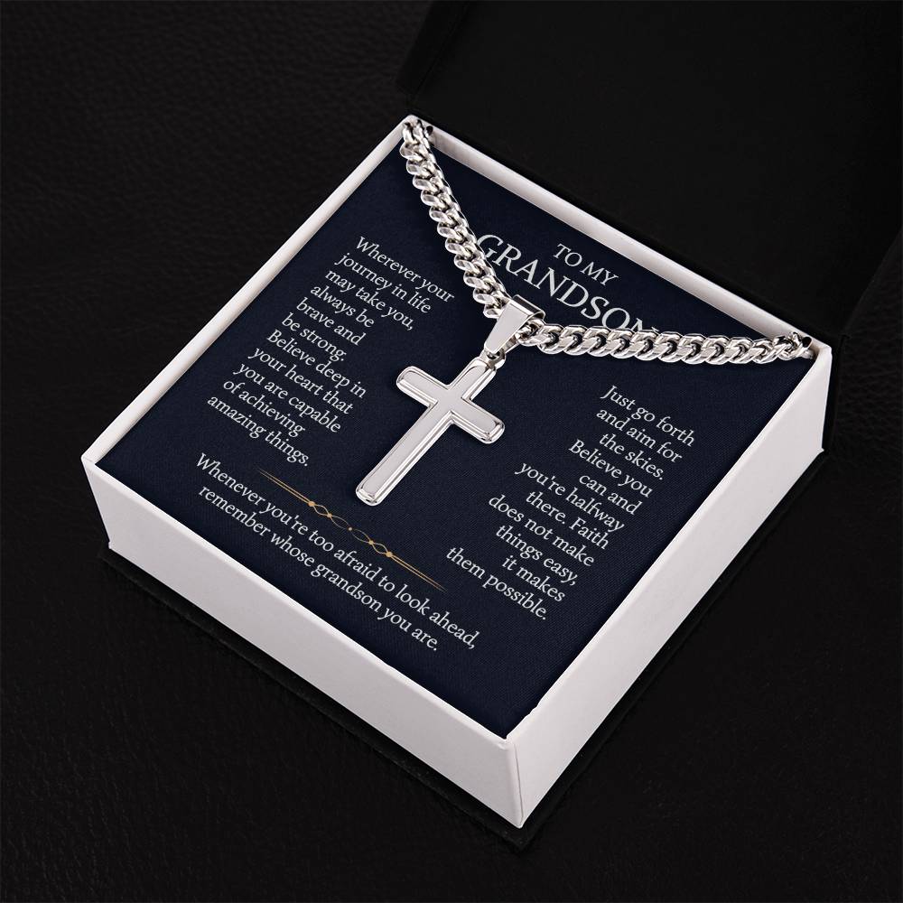 To My Grandson Cuban Chain with Artisan Cross Necklace | Jewelry From Grandma Grandpa | Graduation Birthday Christmas Gift For Grandson