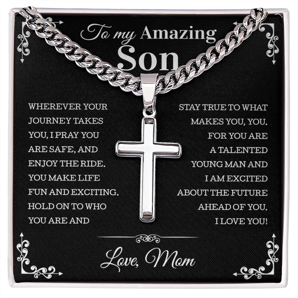 To My Son From Mom Necklace, Mother Son Necklace, Son Jewelry, Gifts for Son From Mom, Christmas Gift for Son, Cuban Chain With Artisan Cross Necklace