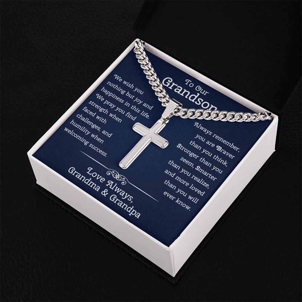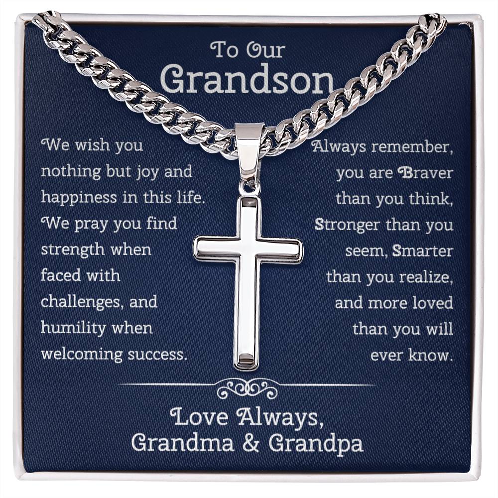 To Our Grandson Gift from Grandma and Grandpa • To Our Grandson Necklace • Cuban Chain With Artisan Cross Necklace