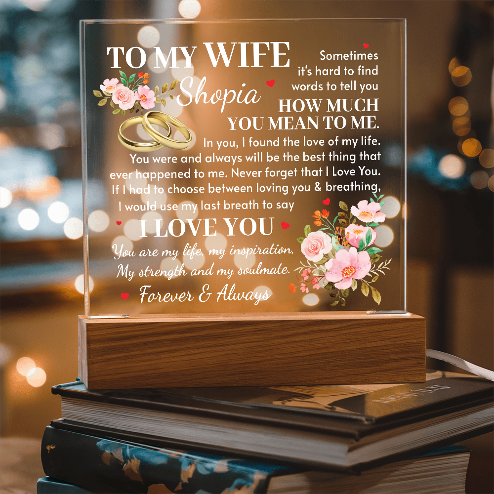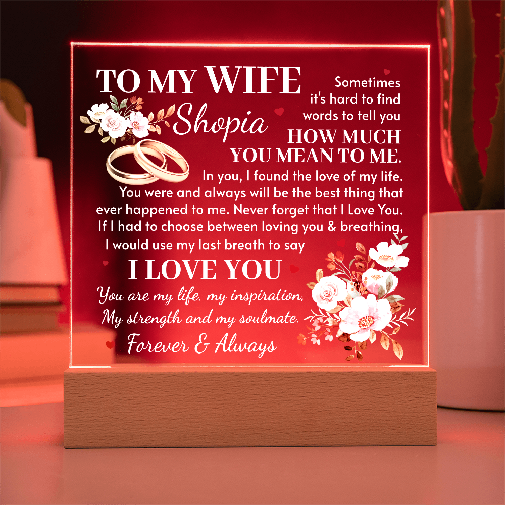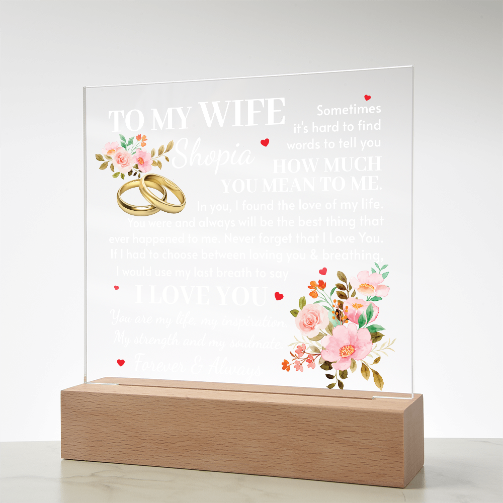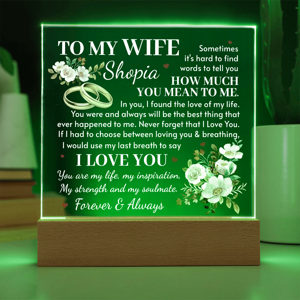 Your plaque will be crafted from premium acrylic with a professionally printed design for a polished look. It comes with a stylish wooden LED base, and you can choose between a USB plug-in option OR a cordless battery-operated option (requires 2 AAA batteries, not included). Both LED bases feature 7 vibrant colors, allowing the user to customize the lighting with various color changes and dynamic cycles.
