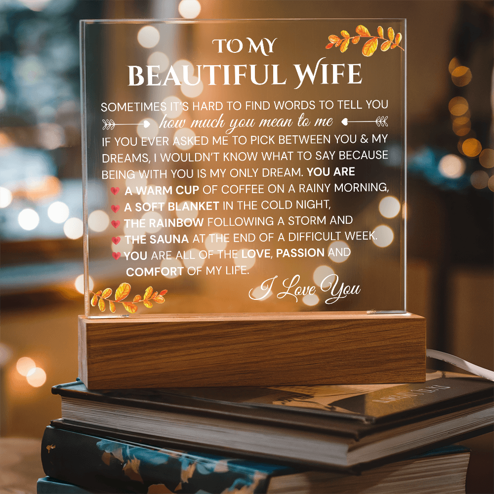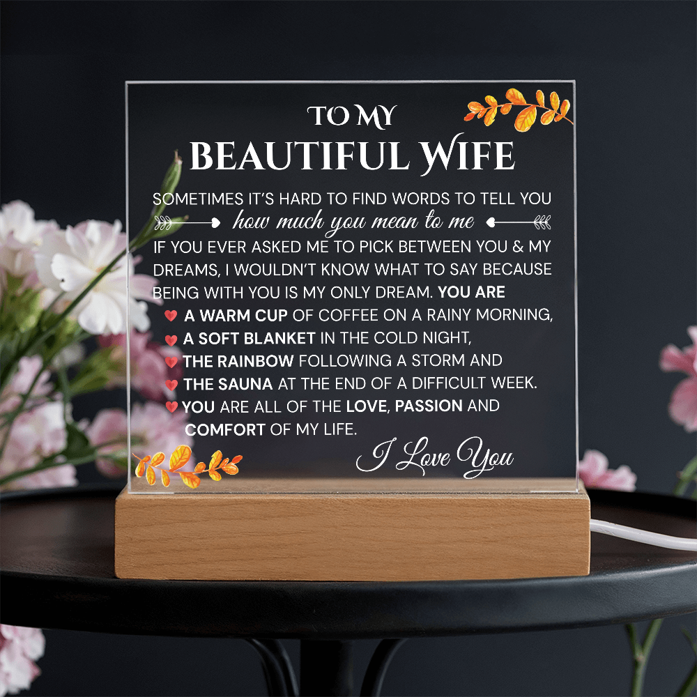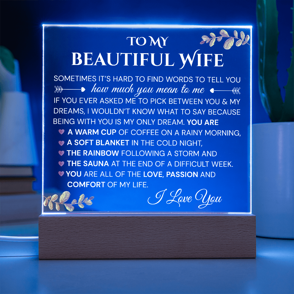 Your plaque will be crafted from premium acrylic with a professionally printed design for a polished look. It comes with a stylish wooden LED base, and you can choose between a USB plug-in option OR a cordless battery-operated option (requires 2 AAA batteries, not included). Both LED bases feature 7 vibrant colors, allowing the user to customize the lighting with various color changes and dynamic cycles.